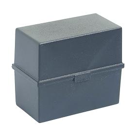 Mit Schnappverschluss. Unterteil und Deckel sind gleich hoch und über Scharnier verbunden, Deckel kann um 180° geöffnet werden. Für ca. 200 Karteikarten.
