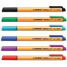 STABILO® GREENpoint®. Faserschreiber für Schüler, Lehrer, Eltern und Büroangestellte mit hohem Umweltbewusstsein. Hergestellt aus 87 % recyceltem Kunststoff. Robuste breite Spitze mit 0,8 mm Durchmesser - für sanftes Schreiben, ausdrucksstarkes Hervorheben und farbintensives Strukturieren. Typbezeichnung der Mine: Faserspeicher. Kann einige Tage offen liegen bleiben, ohne einzutrocknen. Handliche Stiftlänge und Clip für mehr Mobilität.