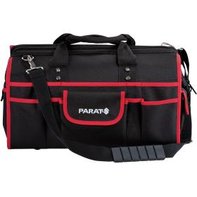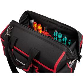 Rund 33 Werkzeuge finden Platz und können so einfach und bequem von Arbeitseinsatz zu Arbeitseinsatz transportiert werden. Für Ordnung sorgen dabei neben einem grosszügigen Hauptfach rund acht Einsteckfächer, acht Gummischlaufen sowie zwei weitere grosse Staufächer im Tascheninneren. Sieben weitere aussenliegende Fächer, zwei davon verschliessbar, sowie ein Massbandhalter aus Metall, ein Einschub für ein Adressetikett, als auch zwei Zurrschleifen für eine Wasserwaage halten zudem weiteres Arbeitsequipment sicher und ordentlich verstaut und schnell griffbereit. Taschenboden kunststoffverstärkt. Integrierte Bodengleiter schützen zudem Arbeitsuntergründe und die Tasche selbst vor Beschädigungen.