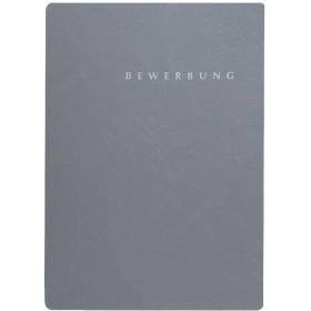 Aus durchgefäbtem Karton mit strukturierter Oberfläche und silbernem Schriftzug BEWERBUNG auf dem Vorderdeckel, 3 Klappen, Halbmondstanzungen, 1 Klemmschiene.