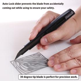 NT Cutter PMGA-EVO2. Ein evolutionäres Modell, an dem sich Profis erfreuen können. Eleganter, robuster und strapazierfähiger Schaft in perlschwarz. Schaft aus strapazierfähigem und leichtem Aluminium-Druckgussgriff. Mit schwarzer Klinge 30°. Klingenführung aus Metall, Klinge mit Schiebermechanik und Klingensperre 'Auto-Lock'. Für Rechts- und Linkshänder geeignet. Klipp mit integriertem Klingenbrecher. Farbe: schwarz. Lieferung mit 1 Klinge in schwarz. Blisterpackung