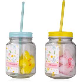 Geschenkset BLOSSOM in Trinkglas mit Strohhalm (gelb und türkis sortiert), inkl. 50ml Mini-Duschgel Blossom, 15g Netzschwamm, 2 Motive sortiert, Duft: Erdbeere, Farbe: pink, VE 6