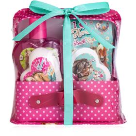 Badeset I LOVE HORSES in Papierkoffer (wiederverwendbar), inkl. 85ml Schaumbad, 100g Badesalz, 50g Badefizzer, 45g Seife