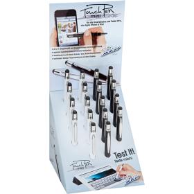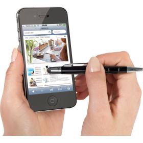 Eingabestift mit Kugelschreiber für alle Smartphones und Tablet PCs. Der weiche Gummiaufsatz ermöglicht das treffsichere Verfassen von Nachrichten und bequeme Navigieren und Scrollen ohne lästige Fingerabdrücke auf dem Display. Funktioniert auch durch Schutz- bzw. Antireflexionsfolien. Mit dem Touch Pen haben Sie gleichzeitig auch immer einen Kugelschreiber zur Hand, ausgestattet mit Drehmechanik, praktischem Clip und einer blauen Metallmine im D1-Format. In sportlichem Design mit zwei horizontalen Gravurlinien auf der hochglänzenden Oberfläche und chromfarbene Zierteile.