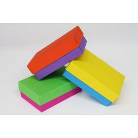 Aus 100% recyceltem Karton, in verschiedenen leuchtenden Farben kombinierbar für eine individuelle, schöne und umweltfreundlche Verpackung, platzsparend, da es sich um eine Faltschachtel handelt, farbig sortiert.