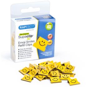 Eine Packung mit 100 Supaclip® Nachfüllklammern mit gelben Emojis für den Gebrauch mit den Rapesco Supaclip® 40 Spender. Der Spender ist einfach zu benutzen und wieder zu verwenden und befestigt die Clips einfach an Papier und vielen anderen Materialien. So behält man z.B. die Papiere in Ordnung, verschliesst Pakete, hält die Chips-Packung zu u.v.m. Sie sehen, die Clips haben viele Verwendungszwecke - im Büro, zu Hause und sogar im Garten. Man muss nicht lochen oder tackern und kann die Supaclip Klammern immer wieder entfernen und wiederverwenden ohne das Papier zu beschädigen. Die Nachfüllklammern sind in einer Reihe von Grössen und Farben erhältlich, aus Edelstahl und bunt, und sind somit perfekt geeignet für die farbliche Kennzeichnung und Sortierung. Auch eine wachsende Reihe an Emoji und Herzen Designs sind erhältlich.