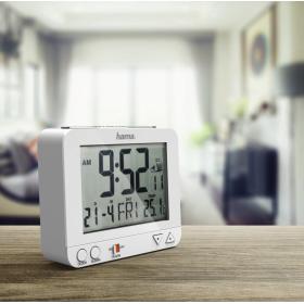 Hama DCF-Funkuhr RC 550 mit digitaler Anzeige von Uhrzeit, Weckzeit, Datum und Temperatur Zweizeilige Displayanzeige mit grosser Zeitanzeige • orangefarbene Hintergrundbeleuchtung • Uhrzeit umschaltbar 12-/24-h-Format • Datumsanzeige (Tag/Monat/Wochentag) • Wochentaganzeige (5 Sprachen: Deutsch, Englisch, Italienisch, Französisch, Spanisch) • eine Alarmzeit programmierbar • Schlummerfunktion • Thermostat umschaltbar zwischen Grad Celsius und Fahrenheit