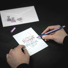 Metallic Rollerball für neuste Möglichkeiten beim Malen, Zeichnen, Schreiben oder Lettern, mit einem Gehäuse aus 88% biobasiertem Kunststoff. Die Ultra-Smooth-Spitze transportiert die hochmetallische Tinte präzise auf das Papier. Strichstärke ca.0,4 mm. Schreibfarbe rose metallic. Kein Pumpen und Schütteln notwendig - Kappe abziehen und loslegen. Ideal geeignet für gestrichenes Papier, wie Einladungs- und Grusskarten oder anderen glatten und nichtsaugenden Untergründen. Schnelltrocknend und geruchsarm. Erhältlich in 8 Metallic-Farben: silver, polar blue, vintage green, gold, vintage red, copper, rose, frosted violet