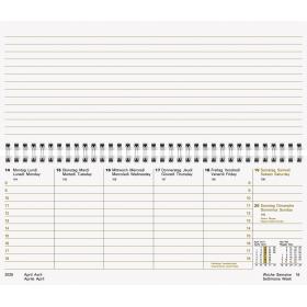 Dieser Kalender von Brunnen verschafft Ihnen einen Überblick jeweils über eine ganze Woche. Ausserdem sind sämtliche Beschriftungen in vier Sprachen, Deutsch, Englisch, Italienisch und Französisch, vorhanden.