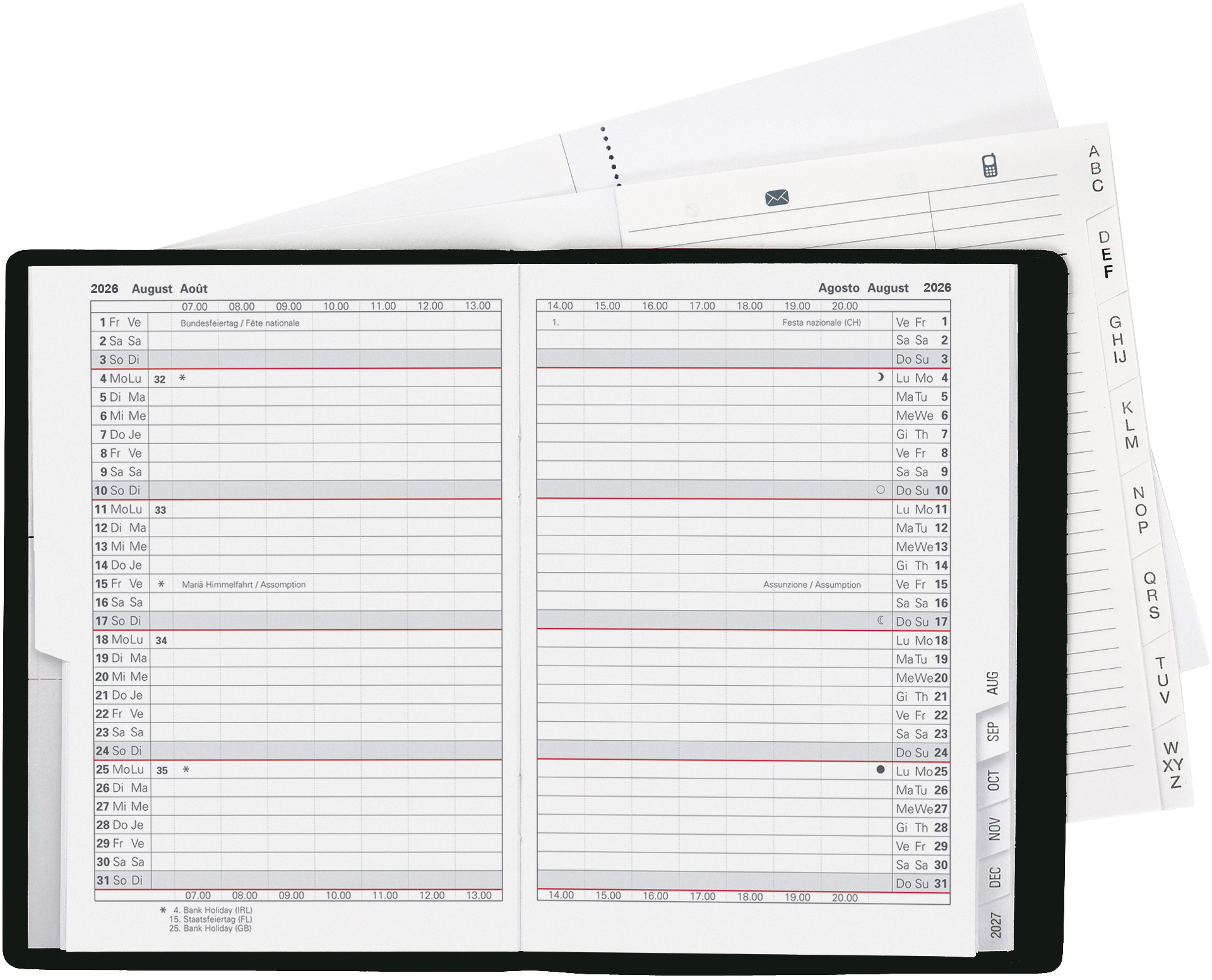 Der Biella Planer Glasgow eignet sich für den Anwender mit grosszügigerem Platzbedarf und enthält ein Kalendarium 1 Monat auf zwei Seiten. Wie üblich enthält der Planer zusätzlich noch jeweils 16 Seiten auswechselbares Adressregister und Notizpapier.