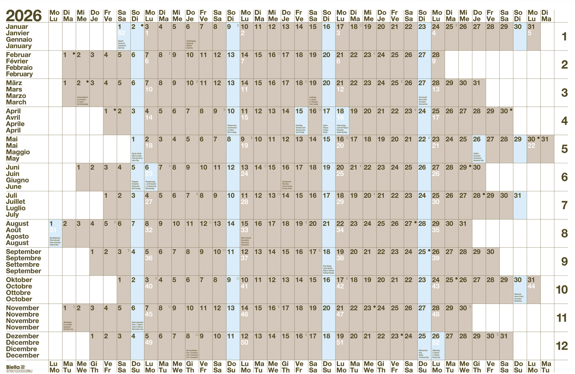 Der Biella Jahresplaner bietet eine Ganzjahresübersicht. Ideal für die Personal- und Ferienplanung.