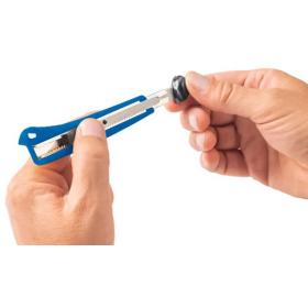 Basic Cuttermesser mit 9 mm Klinge. Formschöne Cutter für saubere Schnittflächen und glatte Kanten. Das vielseitige Werkzeug für den universalen Einsatz. Die Standard-Abbrechklinge, aus rostfreiem Stahl, kann mittels Rasterautomatik vorgeschoben werden. Die Metallführung der Schneidklinge sorgt für Sicherheit im Handling und garantiert einen exakten Schnitt. Eine Abbrechhilfe ist im Griffteil des ABS-Kunststoffgehäuses integriert. Der ergonomisch geformte Griff garantiert guten und sicheren Halt. Lieferung mit eingesetzter Klinge auf SB-Karte