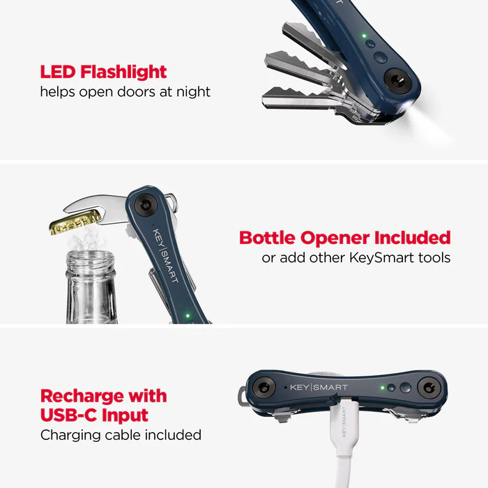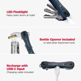 • Benachrichtigen Sie sich, wenn Sie Ihre Schlüssel vergessen. Die Apple „Wo ist?“ App verhindert proaktiv, dass Sie Ihre Schlüssel verlieren, indem sie Benachrichtigungen an Ihr iPhone sendet, wenn Sie Ihre Schlüssel vergessen. Sorgen Sie dafür, dass Ihre Schlüssel leise, kompakt und bequem sind. Organisieren Sie bis zu 14 Ihrer vorhandenen Schlüssel und Ihren Autoschlüssel mit dem KeySmart® iPro. Die einfache Einrichtung erfordert kein Werkzeug und ist für alle Schlüsseltypen geeignet. Ergänzen Sie Ihr zuverlässiges Multifunktionswerkzeug mit einem unserer Mini-Tools oder MagConnect. Wiederaufladbarer Akku mit langer Laufzeit und Ladestandsanzeige. Der KeySmart® iPro wird von einem Lithium-Polymer-Akku angetrieben und hat eine Laufzeit von bis zu 30 Tagen.