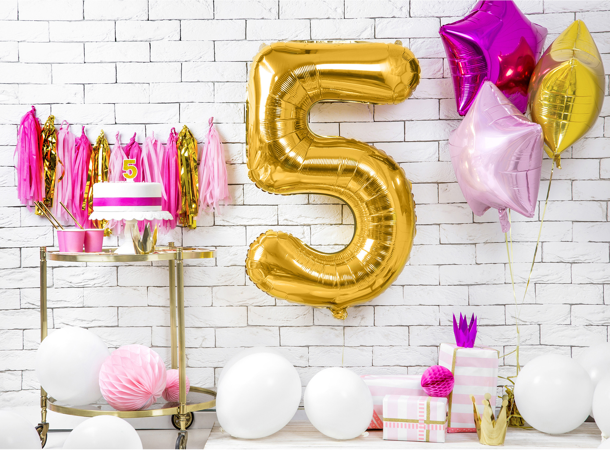 Der metallische Folienballon mit der Ziffer 5 ergänzt die Geburtstagsszenerie auf stilvolle Weise. Vor dem Aufblasen misst er 100 cm, nach dem Aufblasen 86 cm. Er kann sowohl mit Luft als auch mit Helium befüllt werden und wird im Set inklusive Strohhalm geliefert, sodass die Vorbereitung besonders einfach ist. Der Ballon ist selbstversiegelnd und mit einem Haken ausgestattet, der eine mühelose Befestigung ermöglicht. Ideal für runde Geburtstage, Jubiläen oder besondere Meilensteine.
