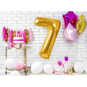 Der metallische Folienballon mit der Ziffer 7 ergänzt die Geburtstagsszenerie auf stilvolle Weise. Vor dem Aufblasen misst er 100 cm, nach dem Aufblasen 86 cm. Er kann sowohl mit Luft als auch mit Helium befüllt werden und wird im Set inklusive Strohhalm geliefert, sodass die Vorbereitung besonders einfach ist. Der Ballon ist selbstversiegelnd und mit einem Haken ausgestattet, der eine mühelose Befestigung ermöglicht. Ideal für runde Geburtstage, Jubiläen oder besondere Meilensteine.