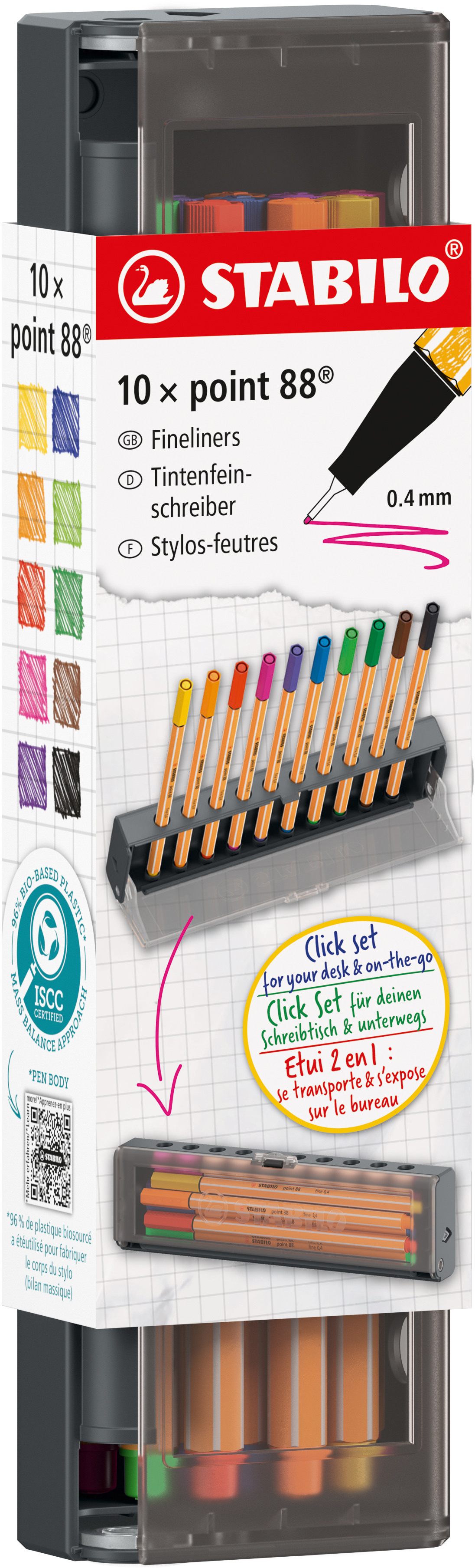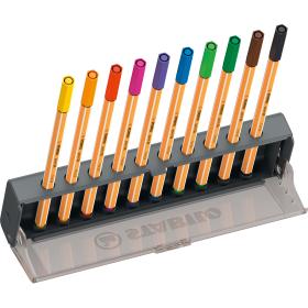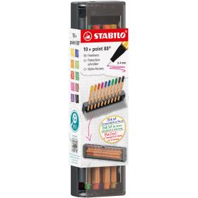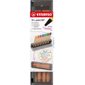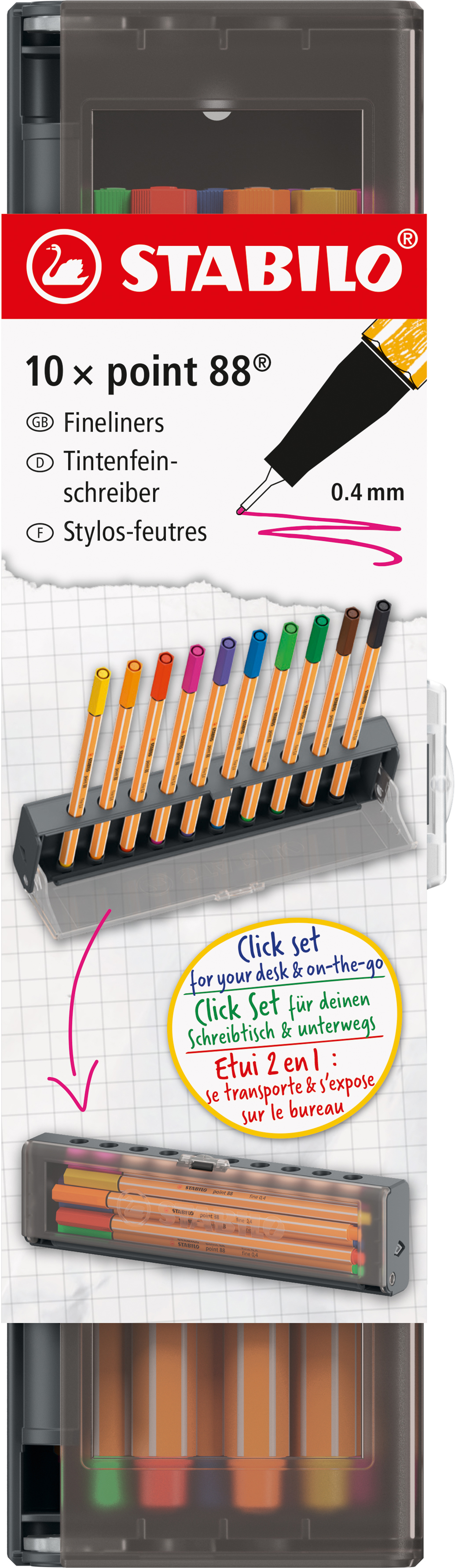 Der Fineliner STABILO point 88 im 10er Stifteset mit praktischer Aufbewahrungsbox. Die metallgefasste Spitze und der hohe Austrocknungsschutz ohne Kappe sorgen für eine herausragende Qualität und machen den STABILO point 88 zu einem Stift, auf den du dich immer verlassen kannst.