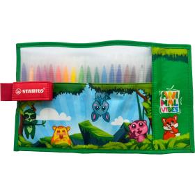 Die STABILO Animal Vibes Kollektion umfasst farbenfrohe, verspielte Versionen beliebter STABILO Produkte in limitierter Auflage. Dieses Rollerset im Animal Vibes Design in der Hauptfarbe Grün beinhaltet 18 Stk. Fasermaler STABILO power. Die Stifte können bis zu 8 Wochen offen liegen und trocknen dennoch nicht aus. Dies ist insbesondere dann ein Vorteil, wenn die Fasermaler auch von kleinen Kindern genutzt werden. Darüber hinaus ist die Tinte der Stifte auswaschbar - kleine Flecken sind somit kein Problem.