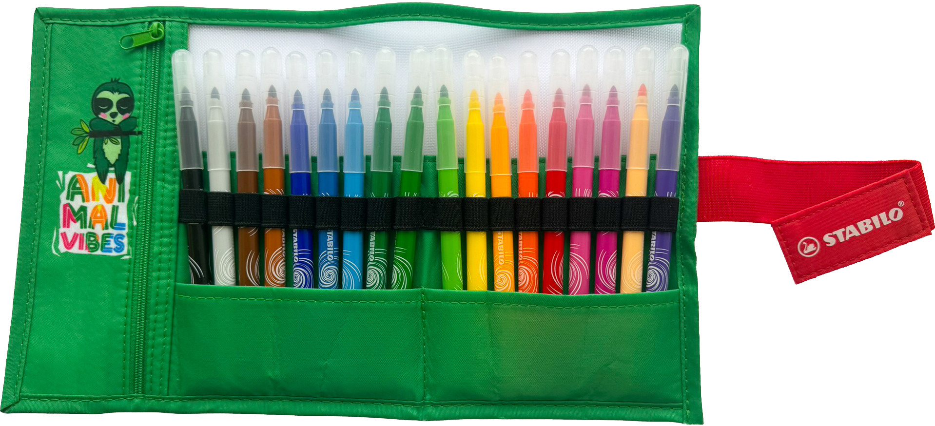 • Verpackung und Inhalt: Premium-Fasermaler STABILO power – 18er Rollerset im Animal Vibes Design in Hauptfarbe Grün (CH-Edition), mit transparentem Sichtnetz, Klettverschluss zum einfachen Öffnen und Verschliessen, Innentasche mit Reissverschluss
