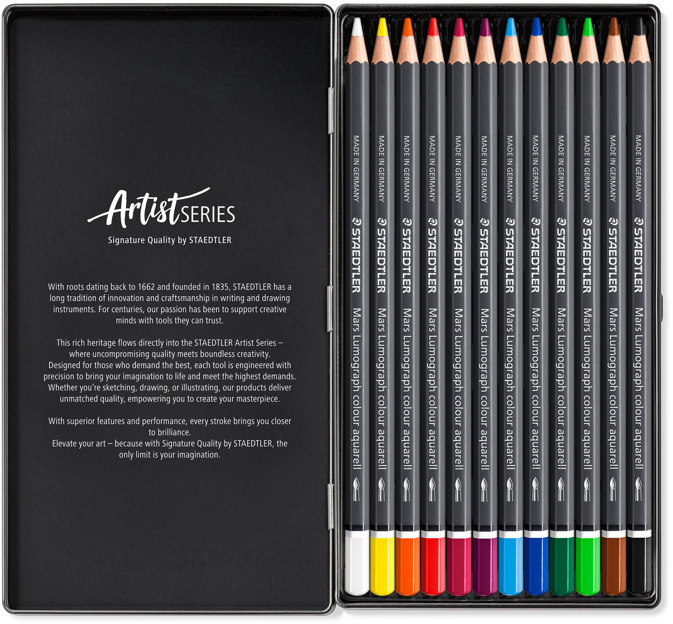 Der ausdrucksstarke Farbkünstler in der Mars Lumograph Reihe – vollständig wasservermalbar und mit einem sanften, lebendigen Auftrag. Nach dem Verblenden mit Wasser bleiben keine Rückstände und es entstehen nahtlose Übergänge. Die hochpigmentierten Minen bieten aussergewöhnliche Lichtbeständigkeit und intensive, lebendige Farben. Die Stifte sind sowohl für Trocken- als auch für Nass-Techniken konzipiert und in 120 fein abgestimmten, konsistenten Farbtönen erhältlich, die unbegrenzte Mischmöglichkeiten und unendliche Farbvariationen bieten.