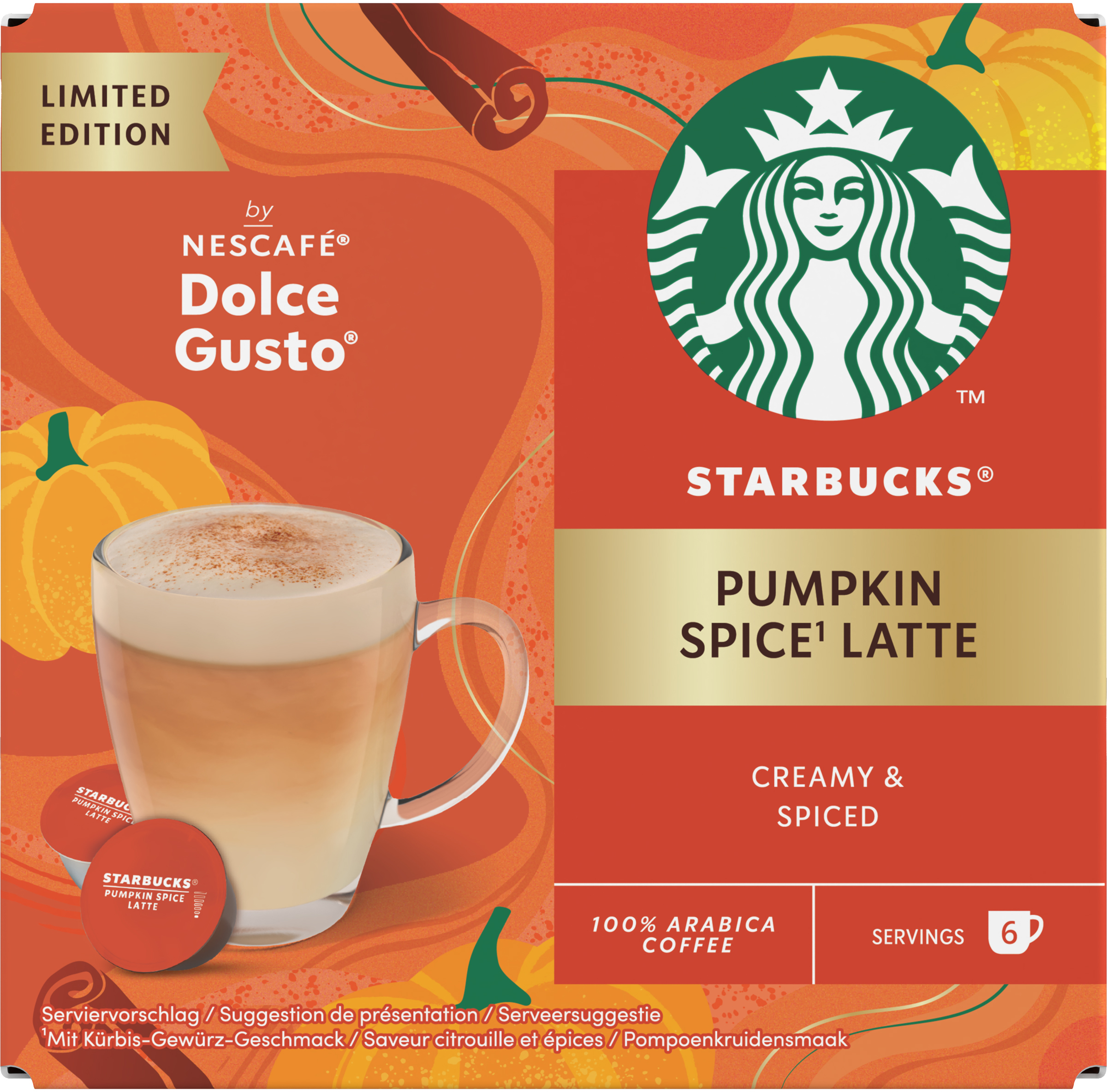 Denken Sie an den Herbst – bunte Blätter, gemütliche Momente und… den STARBUCKS® Pumpkin Spice Latte von NESCAFÉ® Dolce Gusto®! Bereiten Sie dieses Kultgetränk zu Hause mit unserer Maschine zu. Espresso und cremige Milch vermischen sich mit Aromen von Kürbis, Zimt und Muskatnuss.