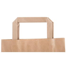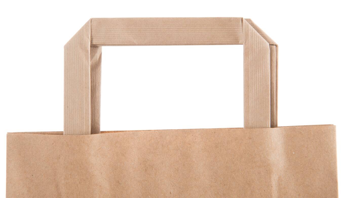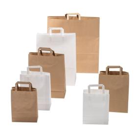 Praktische Tragetaschen aus Papier mit innen angeklebtem 5-fach gefaltetem Flachhenkel, Verstärkungsblatt am Griff sowie Boden- und Seitenfalte. Grammatur: 90 g/m².