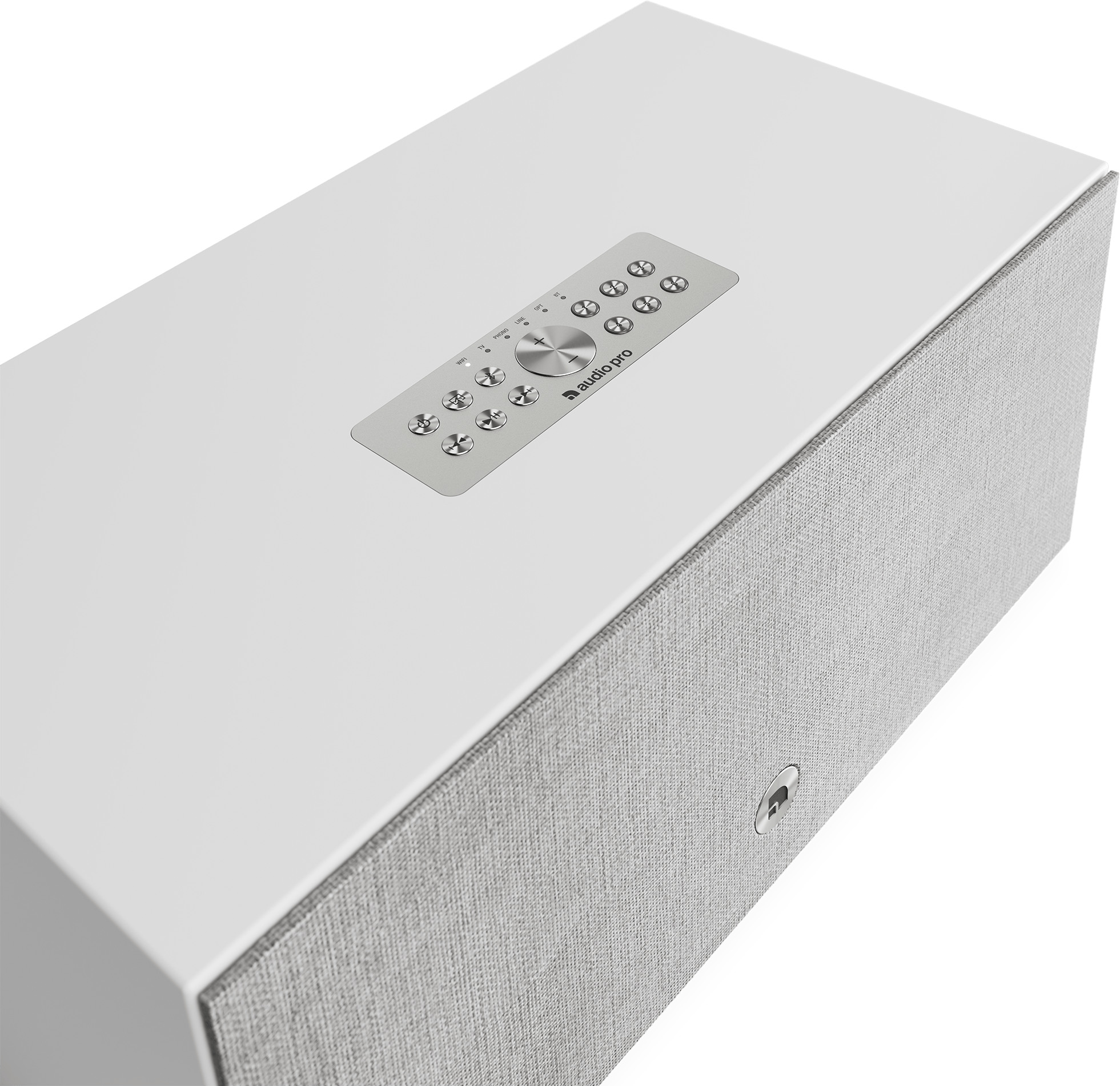 - Sie können Musik auch auf andere Audio Pro-Lautsprecher streamen, die Sie an ein Multiroom-System angeschlossen haben. Das Holzgehäuse in sanftem Satinweiß, stilvollem Grau oder klassischem Schwarz fügt sich harmonisch in Ihr Zuhause ein. Optional ist auch ein exklusives Walnussfurnier erhältlich. Die Stofffront ist magnetisch befestigt und lässt sich für einen moderneren Look leicht abnehmen, falls Sie dieses Design bevorzugen