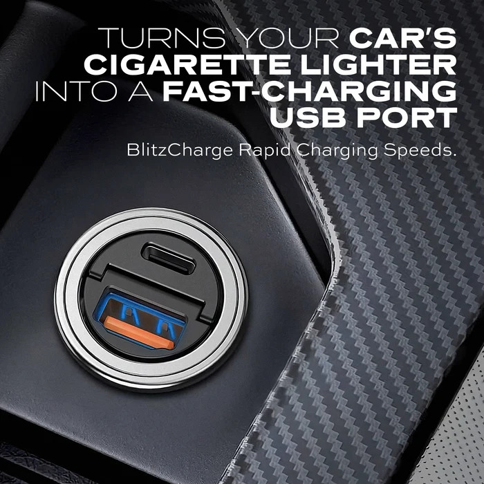 Verwandelt den Zigarettenanzünder Ihres Autos in einen USB-Schnellladeanschluss. Dieser Adapter ermöglicht BlitzCharge-Schnellladegeschwindigkeiten über den Zigarettenanzünder Ihres Autos oder LKWs.