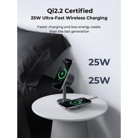 Qi2.2-zertifiziertes 25-W-Schnellladen: Zertifiziert nach dem neuesten Qi2.2-Protokoll bietet es einen beispiellosen kabellosen Standard von 25 W und sorgt so dafür, dass Ihre Telefone blitzschnell geladen werden. Die Einführung von Qi2.2 macht es zu einem der Pioniere der innovativen kabellosen Ladetechnologie.