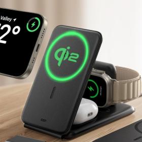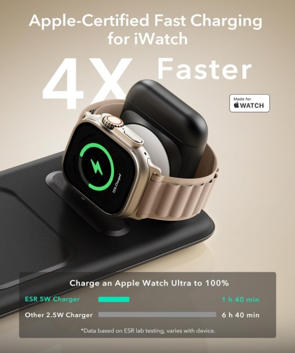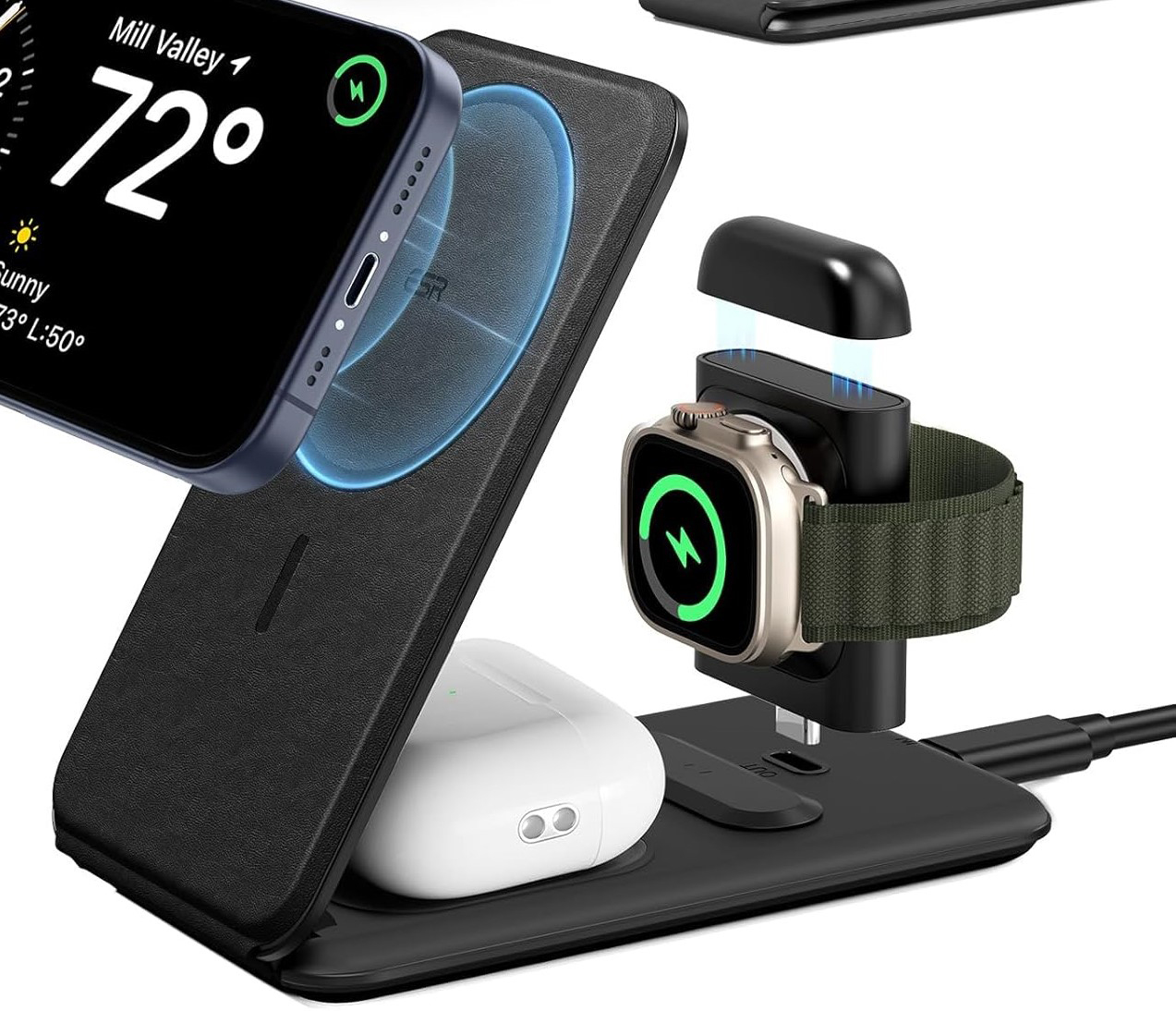 - 1.000 g magnetische Haltekraft sorgen dafür, dass Ihr Smartphone während des Ladevorgangs fest an seinem Platz bleibt, da die im Watch-Ladegerät und im AirPods-Ladepad integrierten Magnete eine sofortige, sichere Ausrichtung gewährleisten