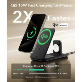 Offiziell Qi2-zertifiziertes 15-W-MagSafe-iPhone-Ladegerät für sicheres und zuverlässiges Laden mit hoher Geschwindigkeit. Versorgen Sie alle Ihre 3 wichtigen Apple-Geräte zusammen, entrümpeln Sie Ihren Schreibtisch oder Nachttisch und entlasten Sie Ihr tägliches Aufladen zu Hause, im Büro und auf Reisen. Kompatibel für MagSafe Ladestation unterstützt iPhone 15/14/13/12 Serie, AirPods Pro/3/2, Apple Watch Ultra, Apple Watch Serie 8/7/6/5/4/3/2/1, und Apple Watch SE 2/1.