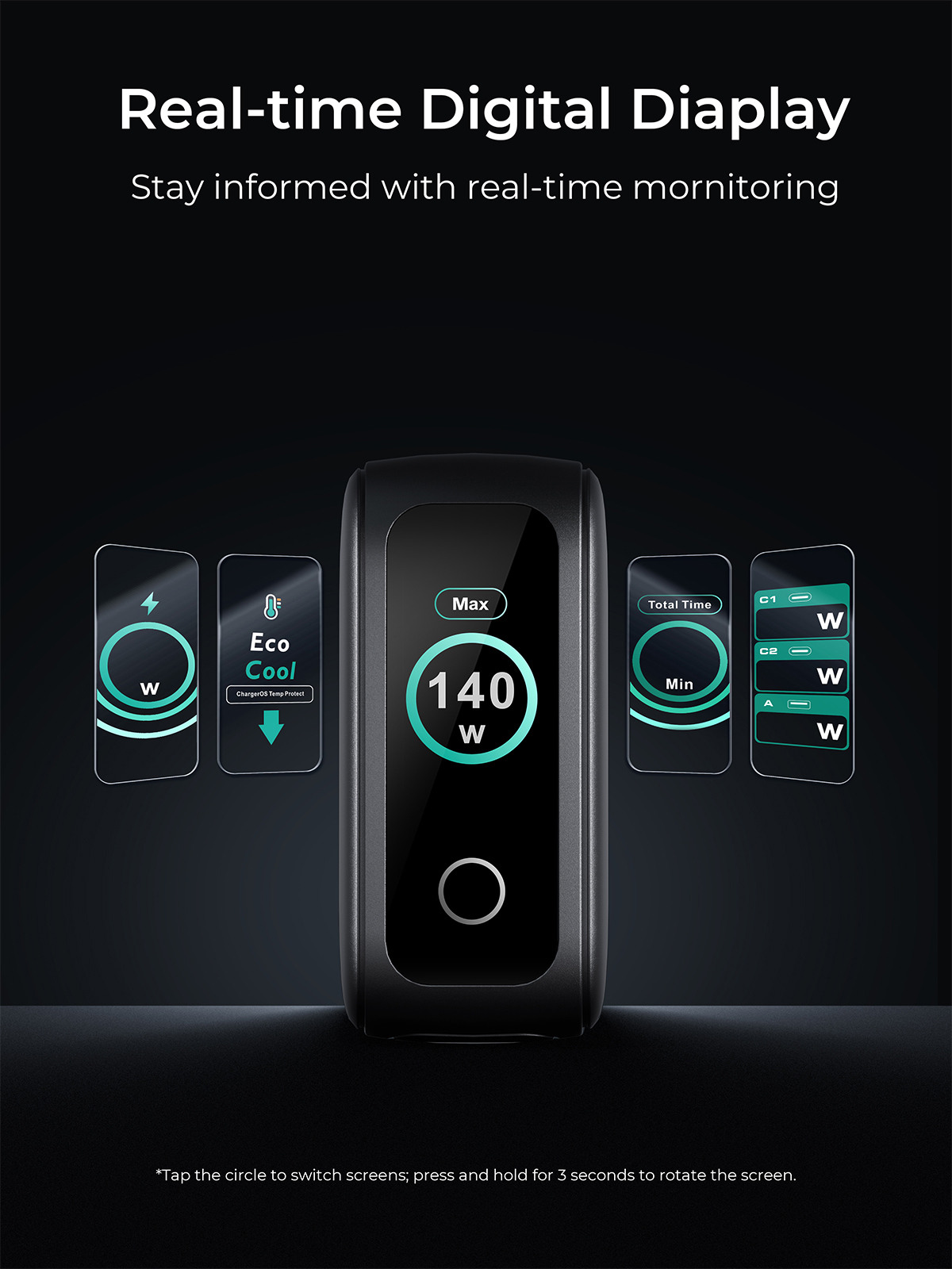 - Ladeanzeige in Echtzeit: Das HD-Smart-Display zeigt den Ladestatus und die Portleistung in Echtzeit an. Durch langes Drücken lässt sich die Bildschirmausrichtung ändern, sodass Sie jederzeit über alle Ladedetails informiert sind.