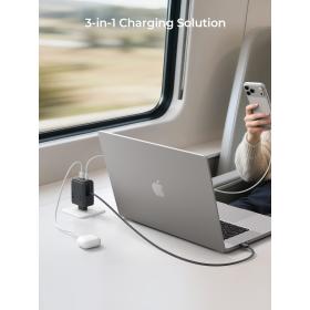 • 3-in-1-Ladelösung: Ausgestattet mit einem 80 cm langen, einziehbaren Kabel, einem USB-C- und einem USB-A-Anschluss, kann es bis zu drei Geräte gleichzeitig schnell aufladen, darunter Smartphones, Laptops, Spielekonsolen usw. Genießen Sie schnelles und effizientes Laden mit nur einem Ladegerät.
