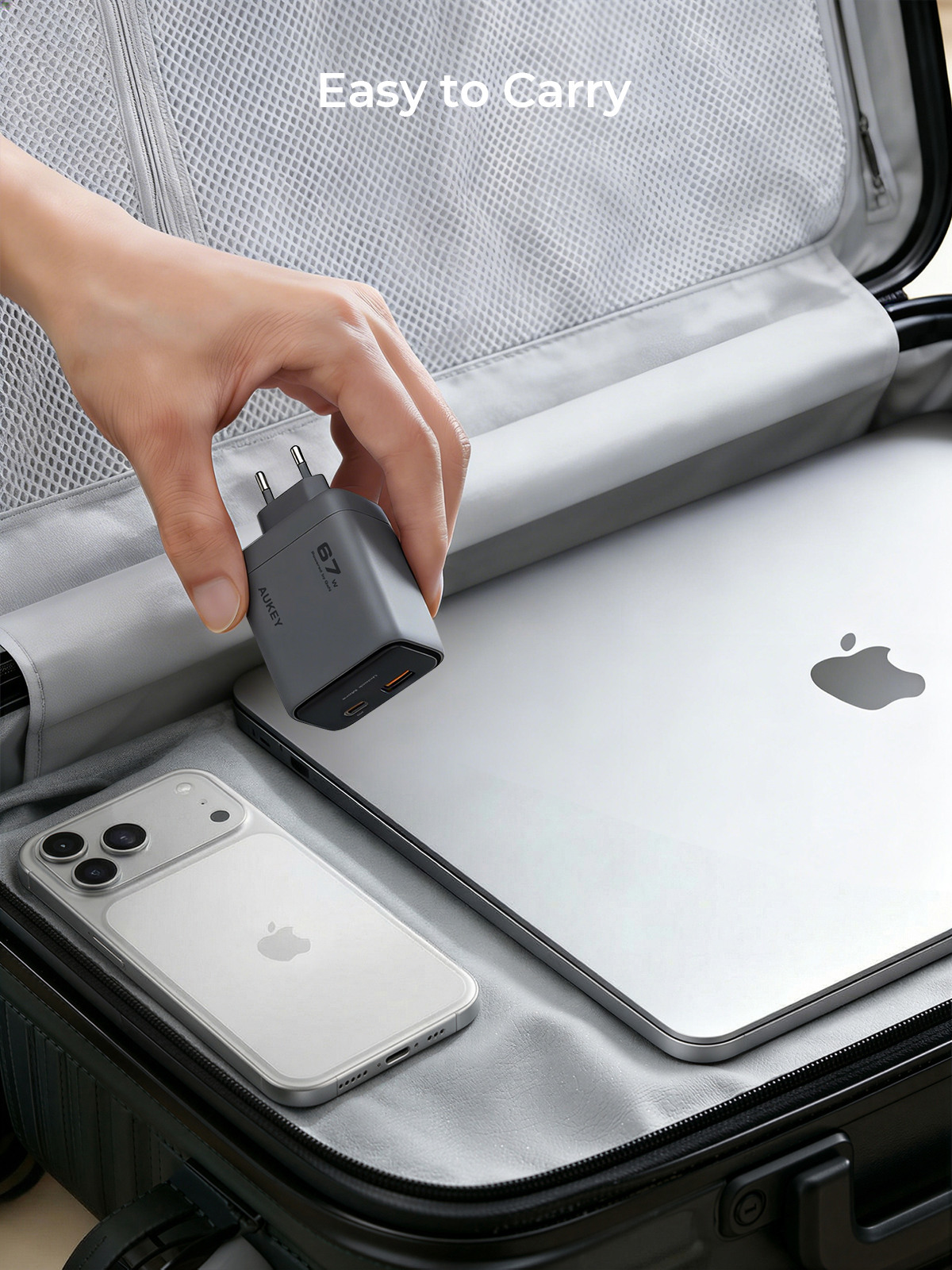 • Ideal für unterwegs: Das kompakte Ladegerät ist verwicklungsfrei, leicht zu transportieren und passt perfekt in jede Tasche oder ins Handgepäck. Obwohl das einziehbare Kabel einen Teil des Innenraums einnimmt, ist es nur 25 % größer als ein herkömmliches 67-W-Ladegerät.