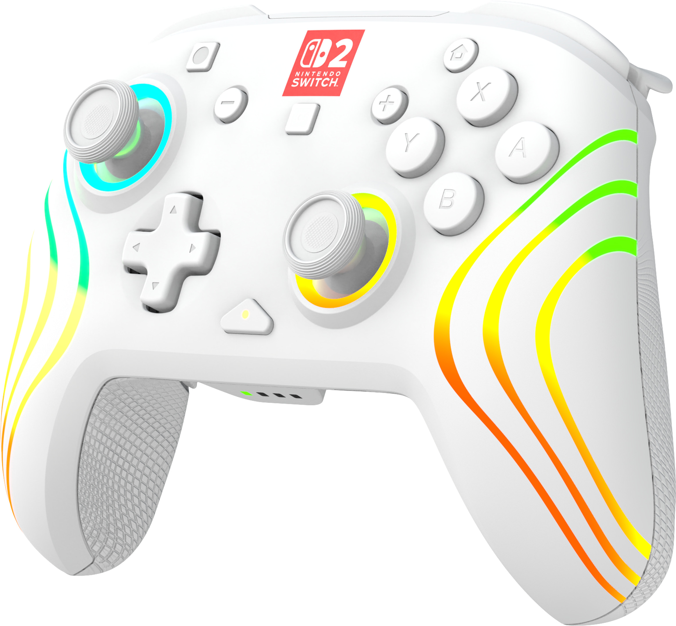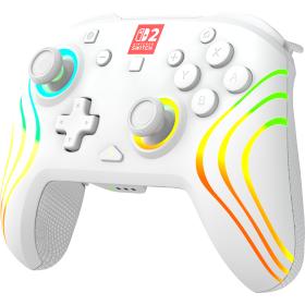 Mach dein Gaming-Erlebnis noch cooler mit dem kabellosen Afterglow Wave RGB-Gaming-Controller für Nintendo Switch™ 2. Dieser Controller ist auch kompatibel mit Nintendo Switch™, Nintendo Switch™ Lite und Nintendo Switch™ - OLED-Modell. Mit acht anpassbaren RGB-Beleuchtungszonen und vier voreingestellten Modi kannst du die Beleuchtung des Controllers ganz einfach an deinen Stil oder deine Stimmung anpassen. Thumbsticks mit integrierter TMR-Sensortechnologie (Tunneling Magnetoresistance) bieten Präzision und Widerstandsfähigkeit, während die integrierte Bewegungssteuerung die Reaktionsfähigkeit verbessert. Mit der praktisch platzierten C-Taste kannst du schnell auf die GameChat-Funktionen zugreifen. Dank des wiederaufladbaren Akkus kannst du bis zu 20 Stunden lang kabellos spielen. Dieser Controller ist offiziell von Nintendo® lizenziert und bietet einen coolen Look, zuverlässige Leistung und den ganzen Tag lang Komfort für jede Gaming-Session.