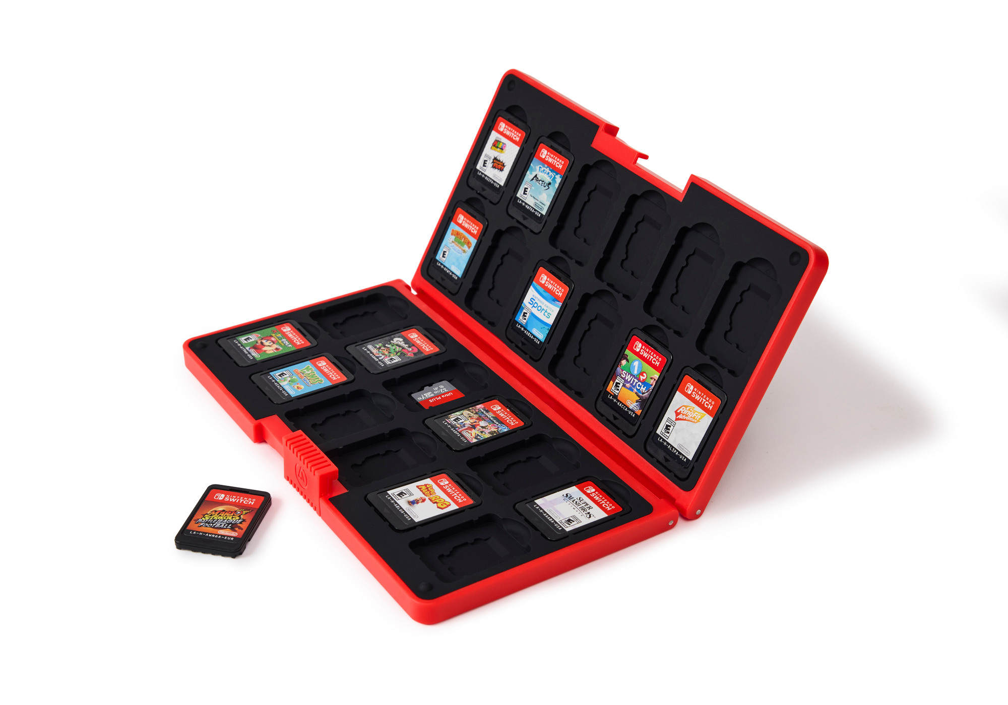 • Formschlüssig – Soft-Touch-Einschübe halten die Game Cards und Micro-SD-Karten an ihrem Platz.
