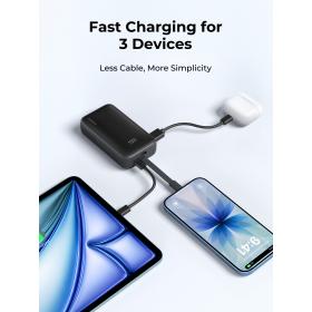 - Gleichzeitiges Laden von 3 Geräten: Ausgestattet mit einem integrierten Kabel, einem USB-C-Anschluss und einem USB-A-Anschluss ermöglicht diese Powerbank das gleichzeitige Schnellladen von 3 Geräten. Dadurch entfallen zusätzliche Kabel, und das Laden wird deutlich vereinfacht.