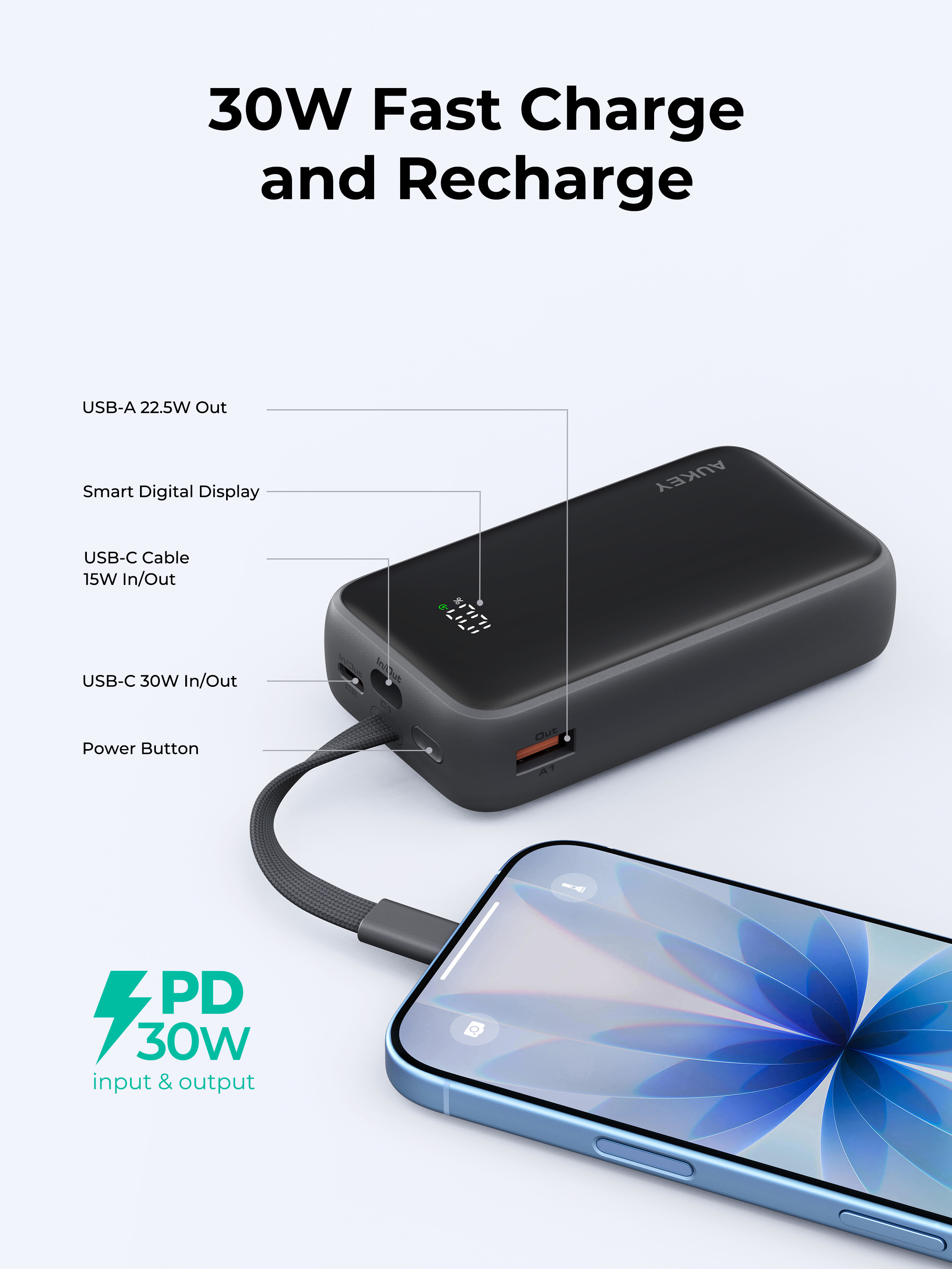 - 30-W-Schnellladen und -Aufladen: Mit einer maximalen Ausgangs- und Eingangsleistung von 30 W unterstützt diese Powerbank das schnelle Laden verschiedener Smart-Geräte und lädt sich selbst schnell auf - entweder über das integrierte, einziehbare Kabel oder über den USB-C-Anschluss. Dies ist praktisch und ideal für kontinuierliches Laden.