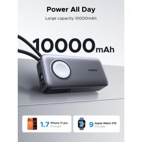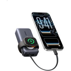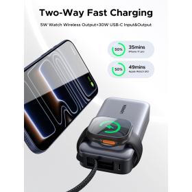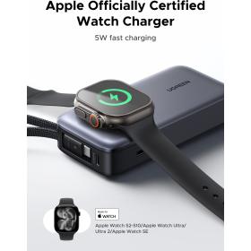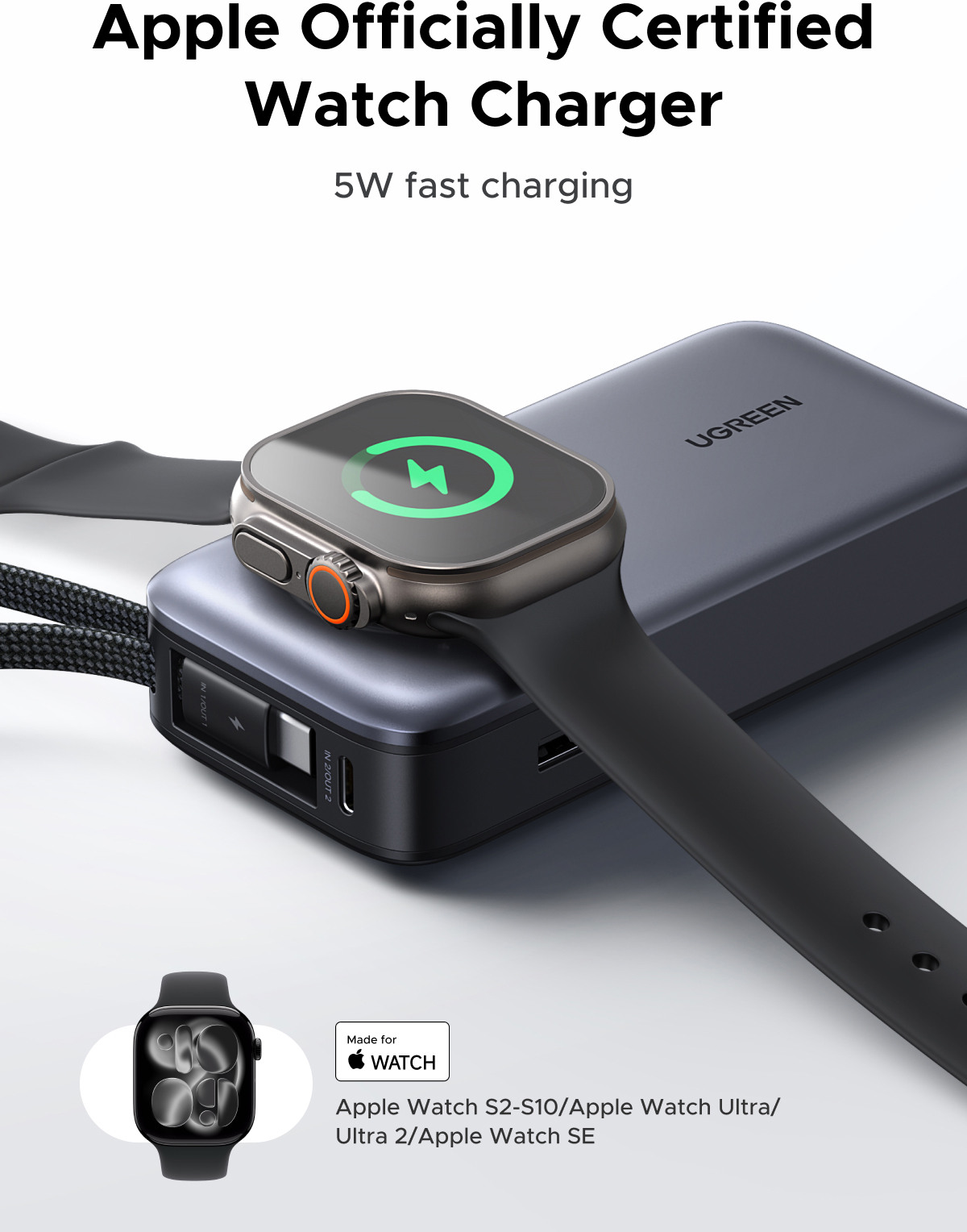 Integriertes 5-W-Magnetladegerät für die Apple Watch: Verfügt über ein spezielles magnetisches Ladegerät für die Apple Watch, sodass Sie das Originalkabel zu Hause lassen können. Hinweis: Diese Powerbank unterstützt kein kabelloses Laden für iPhones oder AirPods.