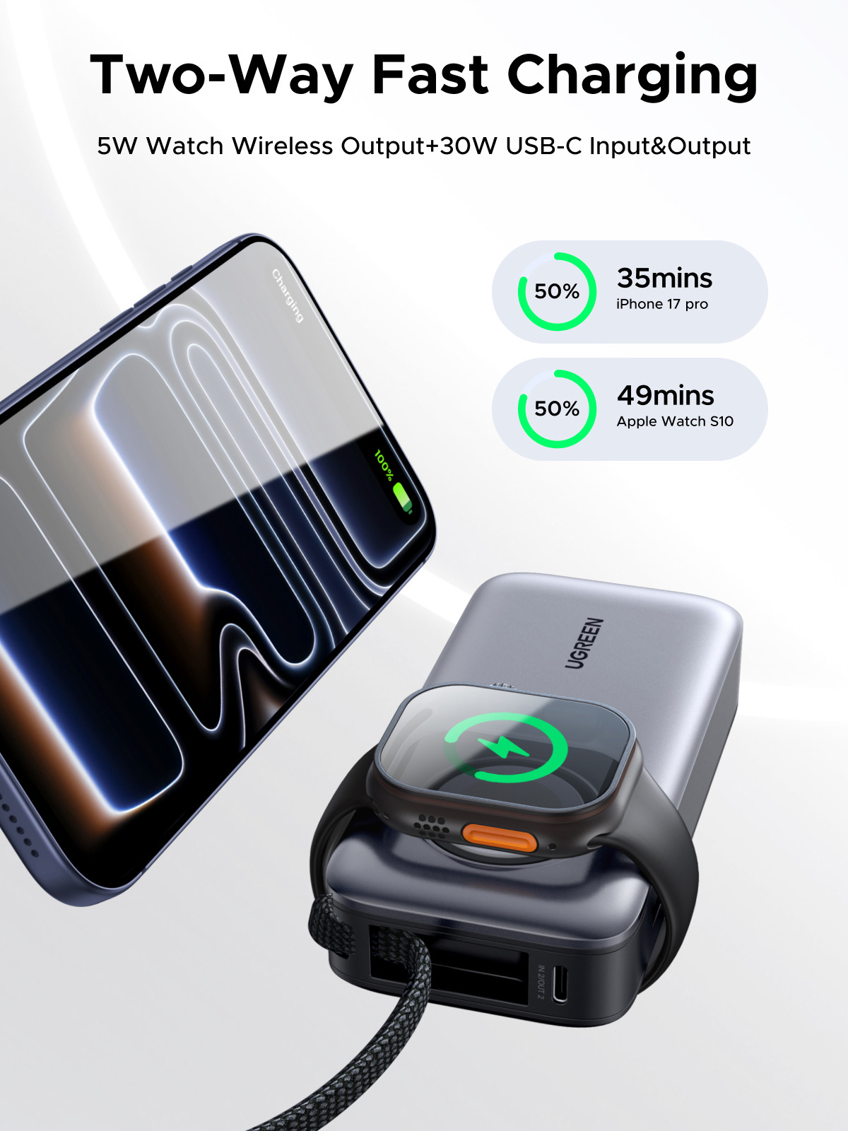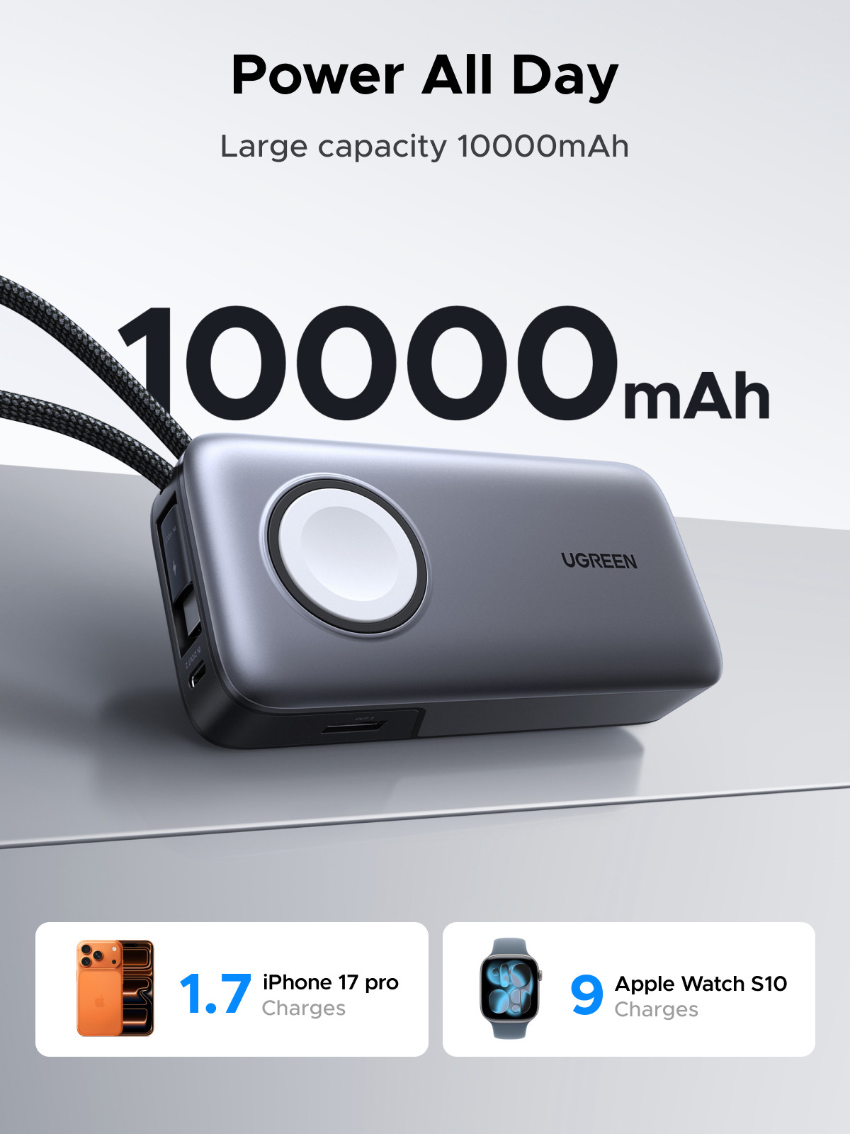 - Umfassende Gerätekompatibilität: Die UGREEN Powerbank unterstützt eine Vielzahl von Schnellladeprotokollen, darunter PD, PPS, SCP und UFCS, und ist vollständig kompatibel mit der iPhone 17/16/15/14/13/12-Serie, dem Galaxy S25/S24 Ultra, der Apple Watch, AirPods und vielen weiteren Geräten.