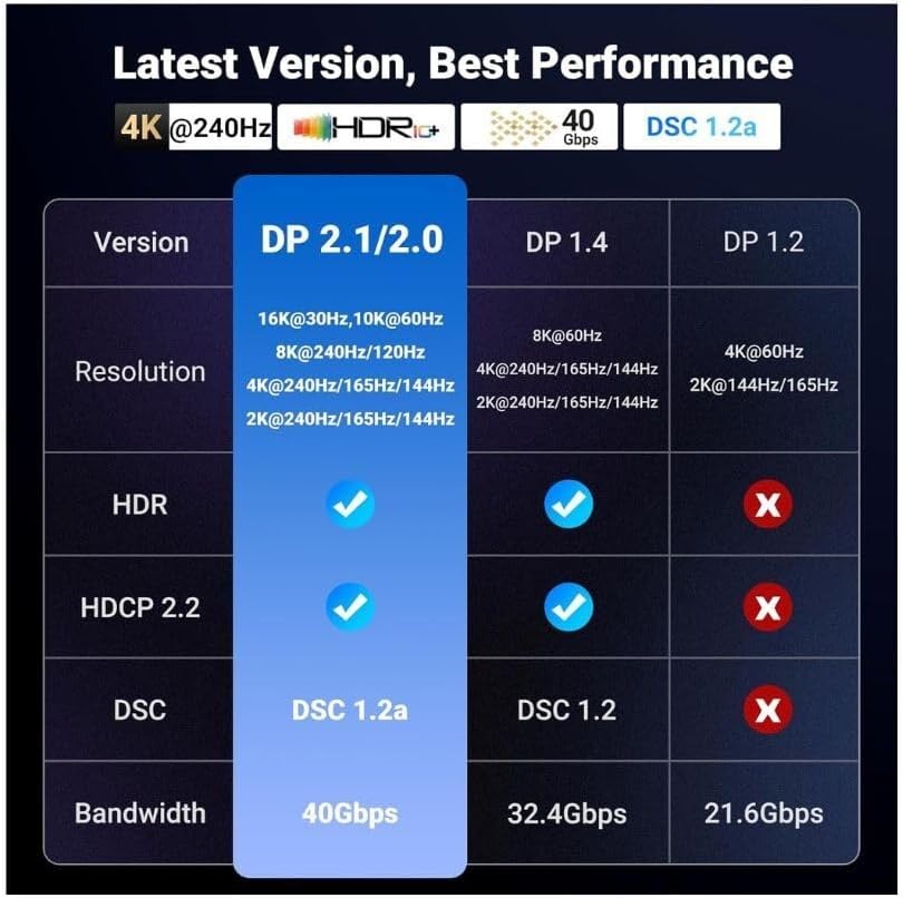 - Dieses DisplayPort-2.1/2.0-Kabel bietet eine beispiellose Bandbreite von 80 Gbit/s - fast dreimal so viel wie der vorherige DP-1.4-Standard. Stabile und schnelle Übertragung ohne Signalverlust. Das DisplayPort-Kabel ist abwärtskompatibel mit den älteren Standards DP 1.4 und DP 1.2. Es entspricht dem VESA-Standard und unterstützt 3D & HDR sowie Dolby & eARC für herausragende Bild- und Tonqualität.