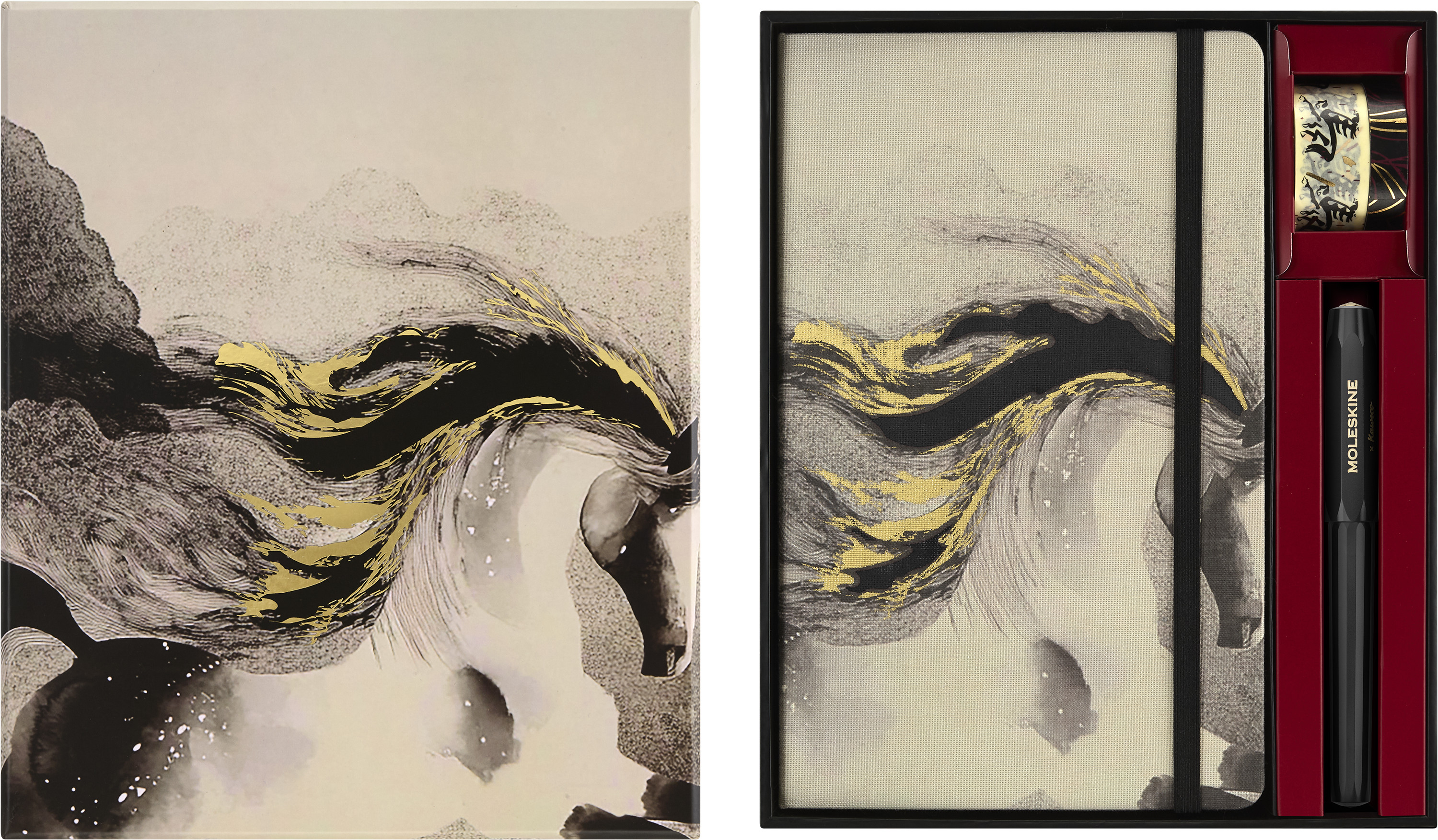 Ein neues Jahr beginnt, und mit ihm ein Aufruf an alle ungezähmten Geister. Das Jahr des Feuerpferdes ist da und lädt uns ein, unser Genie zu entfesseln und neue Ideen zu entfachen. Diese kraftvolle Special Edition fängt wilde Gedanken und brennende Leidenschaften ein und lässt Ihrer Fantasie freien Lauf, um Ihre innere Freiheit zu enthüllen. Jetzt steht Ihrer inneren Freiheit nichts mehr im Wege. Dieses umfassende Kreativset enthält ein liniertes Notizbuch, zwei Washi Tapes, einen schwarzen Kaweco Kugelschreiber und ein aufklappbares "Endlos" Notizbuch, um Ihre Ideen fliessen zu lassen. Eine Geschenkbox, die Ihrem Genie freien Lauf lässt.