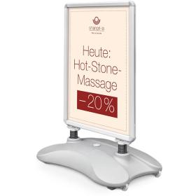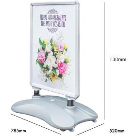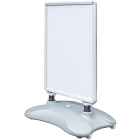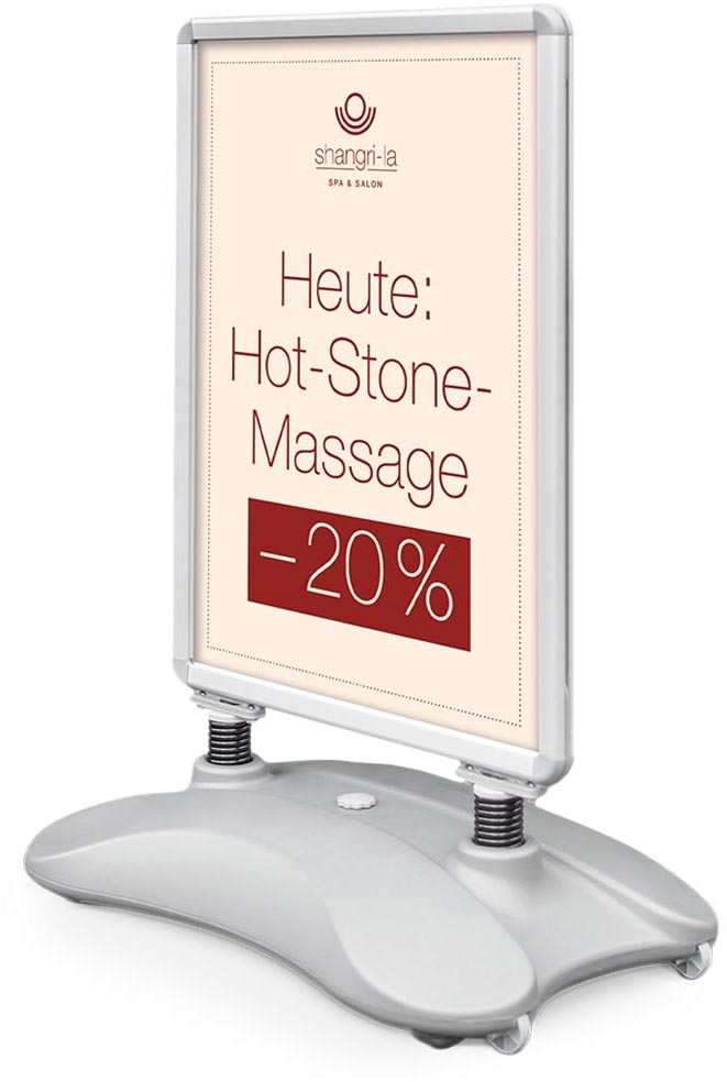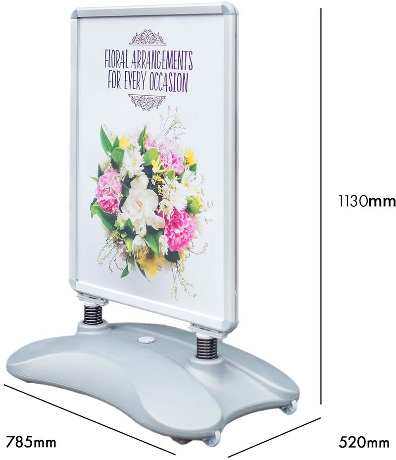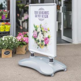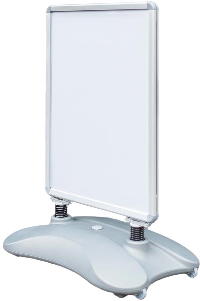 Dieser Kundenstopper eignet sich perfekt für den Außen- und Innenbereich. Sein robuster, gebogener Kunststoffsockel verfügt über einen Einfüllverschluss, durch den Sie Wasser als Ballast einfüllen können. Zwei Federn verbinden den Sockel mit dem Rahmen, sodass übermäßige Windkräfte abgeleitet werden können. Der silberne A1-Klapprahmen ermöglicht eine beidseitige Präsentation Ihrer Bodenwerbung. Plakate können durch Öffnen des Rahmenrandes leicht ausgetauscht werden – ganz ohne Werkzeug. Der gebogene Sockel verfügt über Räder und einen Griff, sodass er sich leicht bewegen und nachts hereinrollen lässt.