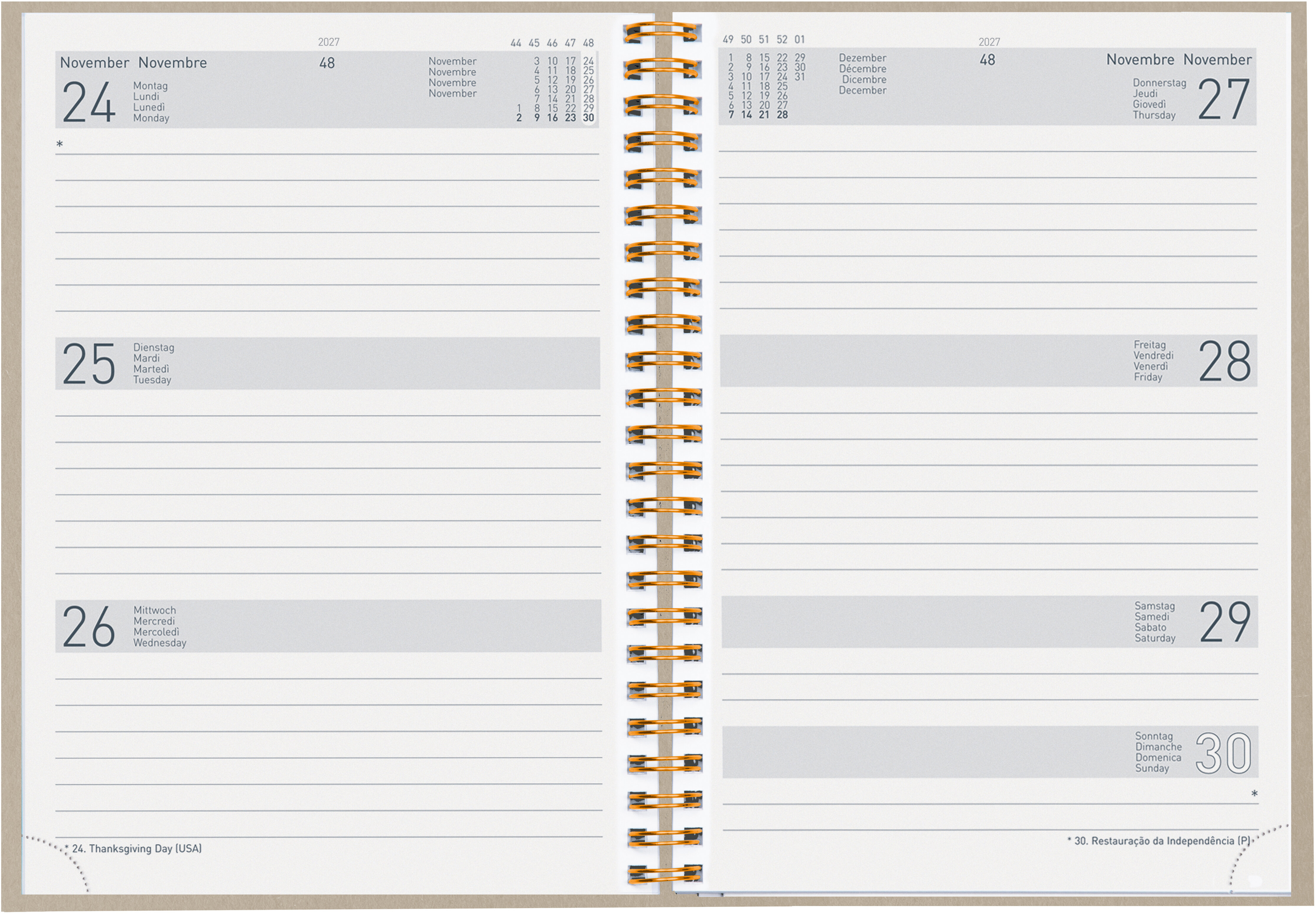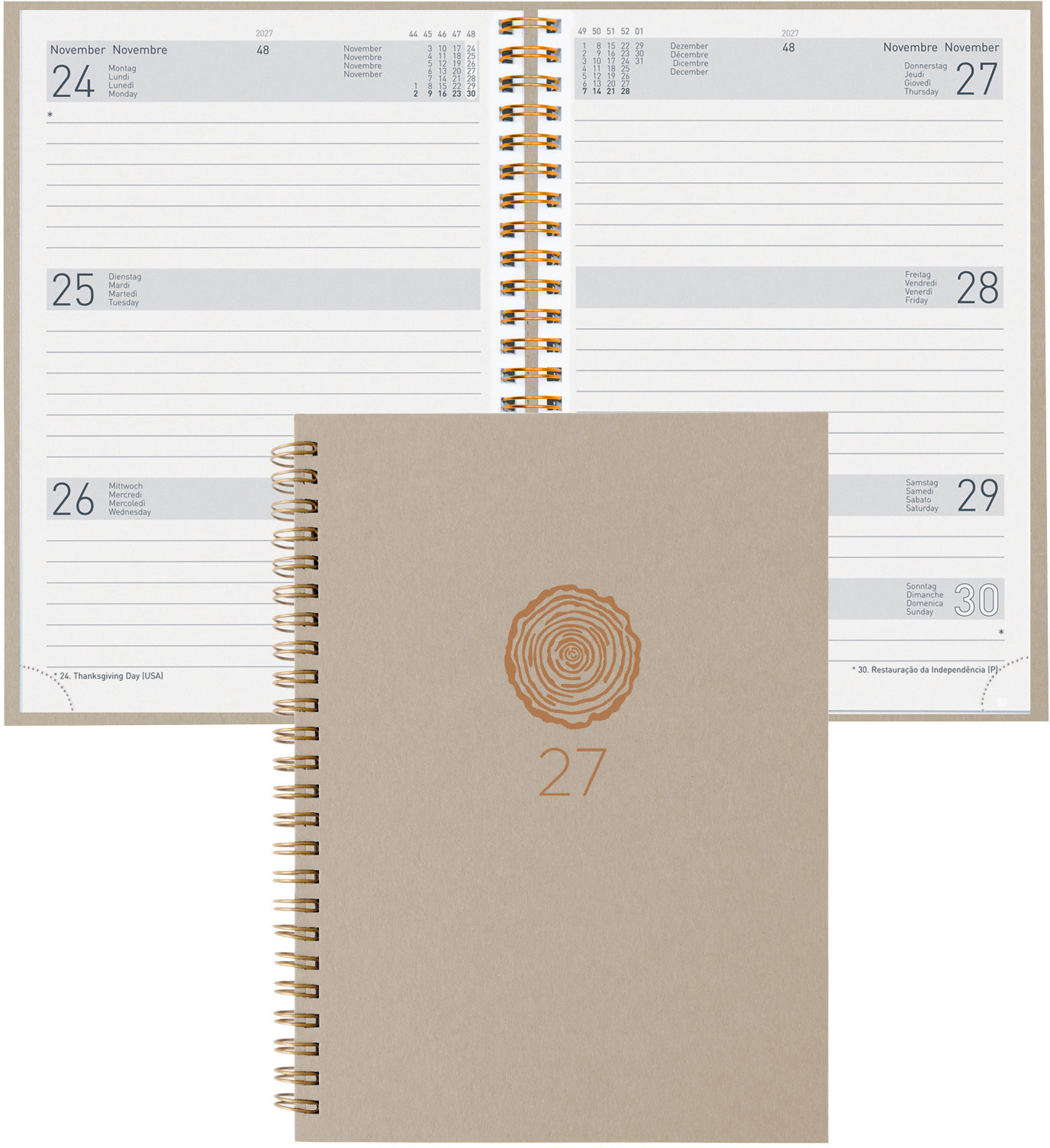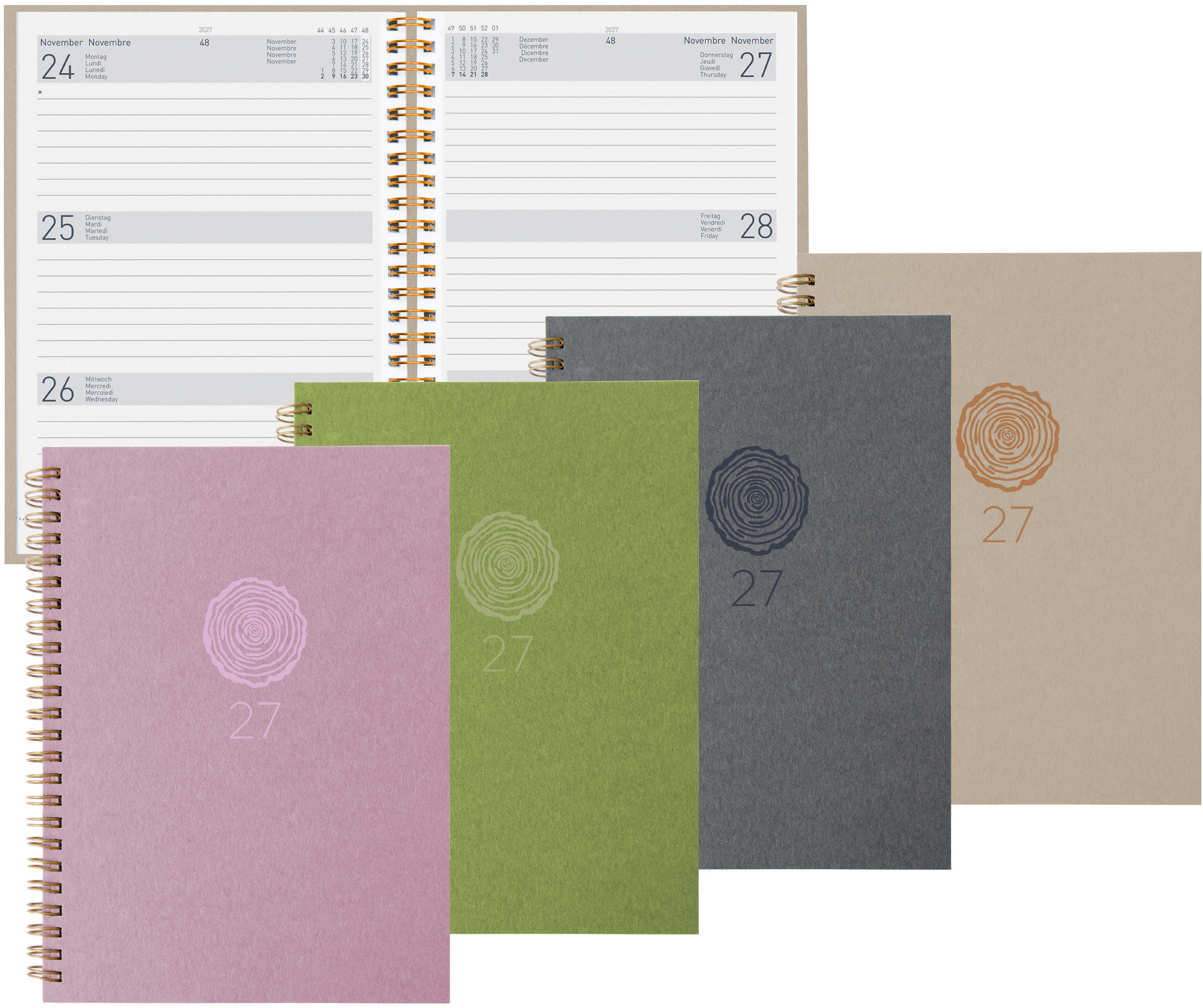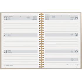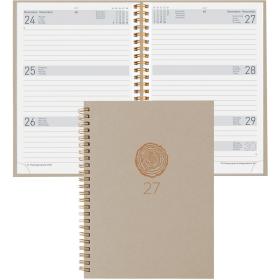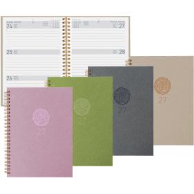 Die Geschäftsagenda Dispo Term Natural Wire-O von Biella ist eine durchdachte Planungsunterstützung für das Jahr 2027. Sie bietet eine praktische Wochenansicht auf zwei Seiten, die es ermöglicht, Termine und Aufgaben übersichtlich zu organisieren. Der Einband besteht aus Recyling-Pappe, was nicht nur umweltfreundlich ist, sondern auch eine ansprechende Haptik bietet