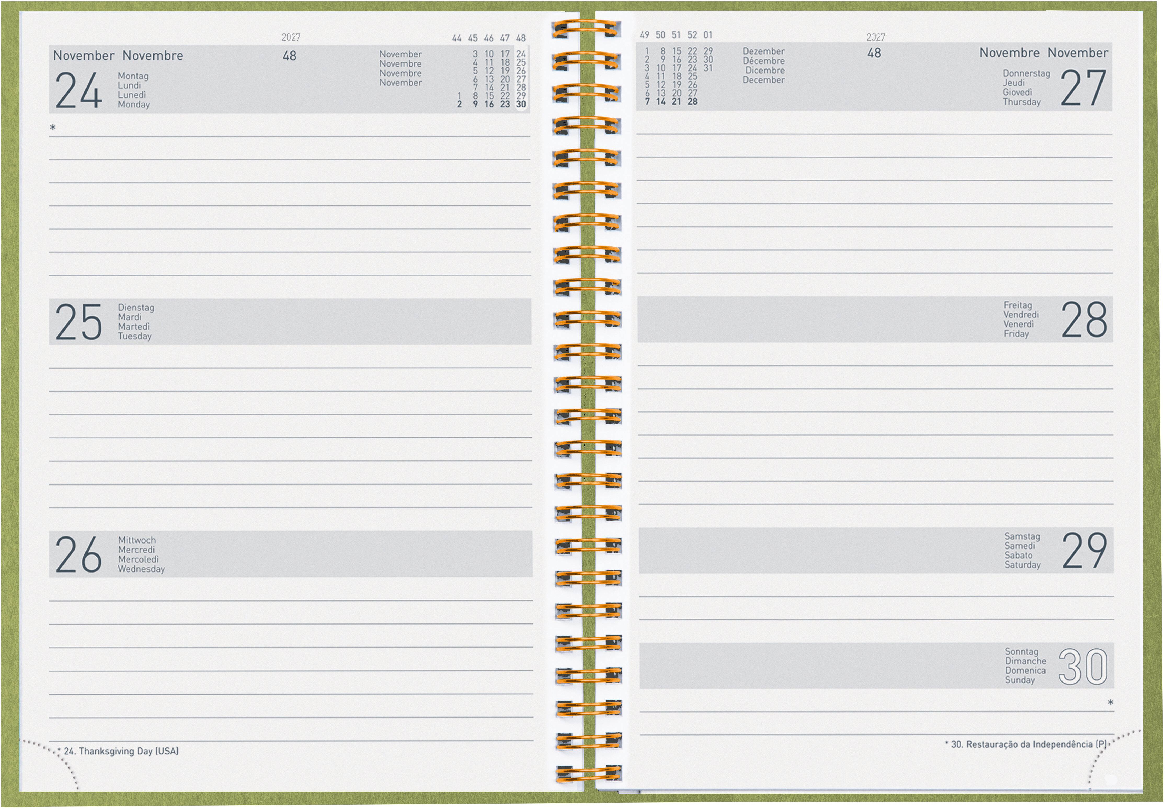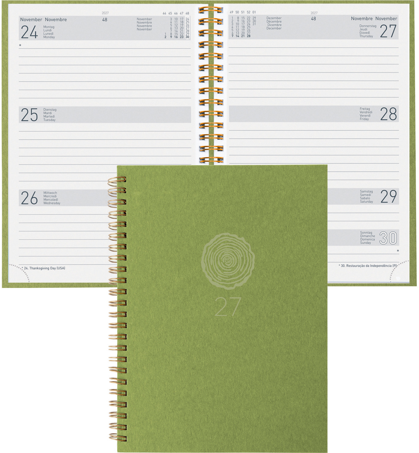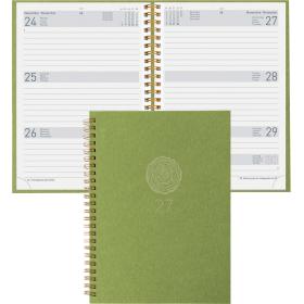 Die Geschäftsagenda Dispo Term Natural Wire-O von Biella ist eine durchdachte Planungsunterstützung für das Jahr 2027. Sie bietet eine praktische Wochenansicht auf zwei Seiten, die es ermöglicht, Termine und Aufgaben übersichtlich zu organisieren. Der Einband besteht aus Recyling-Pappe, was nicht nur umweltfreundlich ist, sondern auch eine ansprechende Haptik bietet