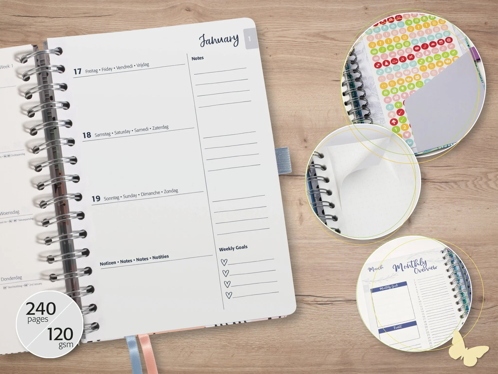 Trendiges Coverdesign mit hochwertigem Motivdruck und glänzender Folienveredelung. Sehr langlebig durch robustes Cover und hochwertige Metallic-Ringbindung. Weisses Papier (FSC-zertifiziert), ideal zum Zeichnen, bedruckt in edlem Grau. Wochenkalendarium mit Monats- und Jahresübersichten, zahlreiche Bullet Journal Seiten mit Planungsteil für jeden Monat (nur EN), zusätzliche Infoseiten wie Ferien und Feiertage (DE/AT/CH/UK/FR/BE/NL). Robustes Cover, hochwertige Metallic-Ringbindung, praktisches Einsteckfach, 2 Lesebänder, Gummibandverschluss, Stiftschlaufe. 16 Blatt perforierte Notizblätter (punktkariert)