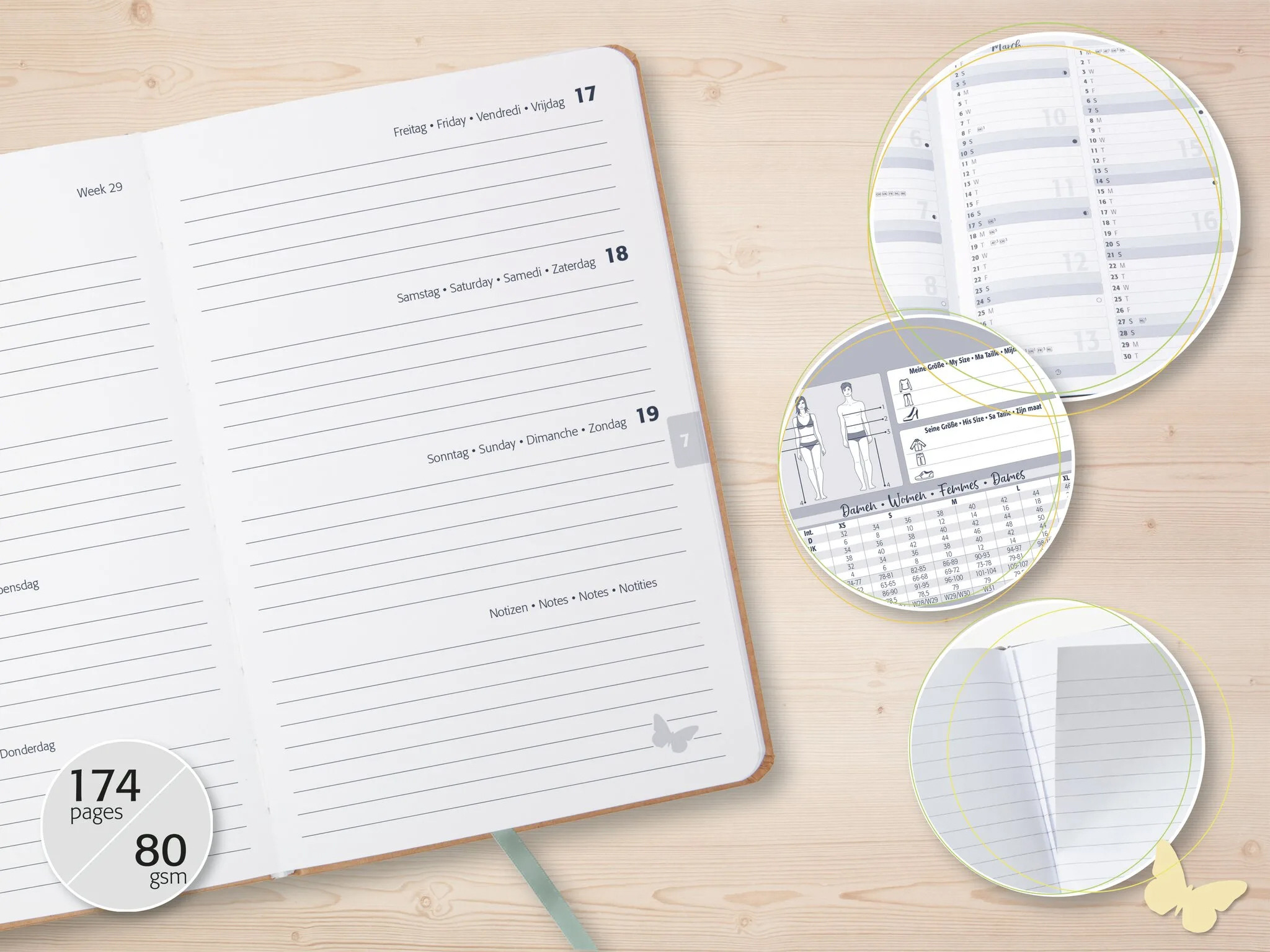 Starkes Cover aus Kraftpapier mit hübschem Print-Design. Sehr langlebig durch hochwertige Fadenbindung. Weisses Papier (80 g/m², FSC-zertifiziert), bedruckt in edlem Grau. Zahlreiche Info-, Motiv- und Planungsseiten: Monats- und Jahresübersichten (nur EN), Ferien und Feiertage (DE/AT/CH/UK/FR/BE/NL), Masstabelle, Reiseziele, Geburtstage u. v. m. Praktische Features: Gummibandverschluss, Stiftschlaufe, Leseband. 12 Blatt perforierte Notizblätter (liniert & punktkariert)