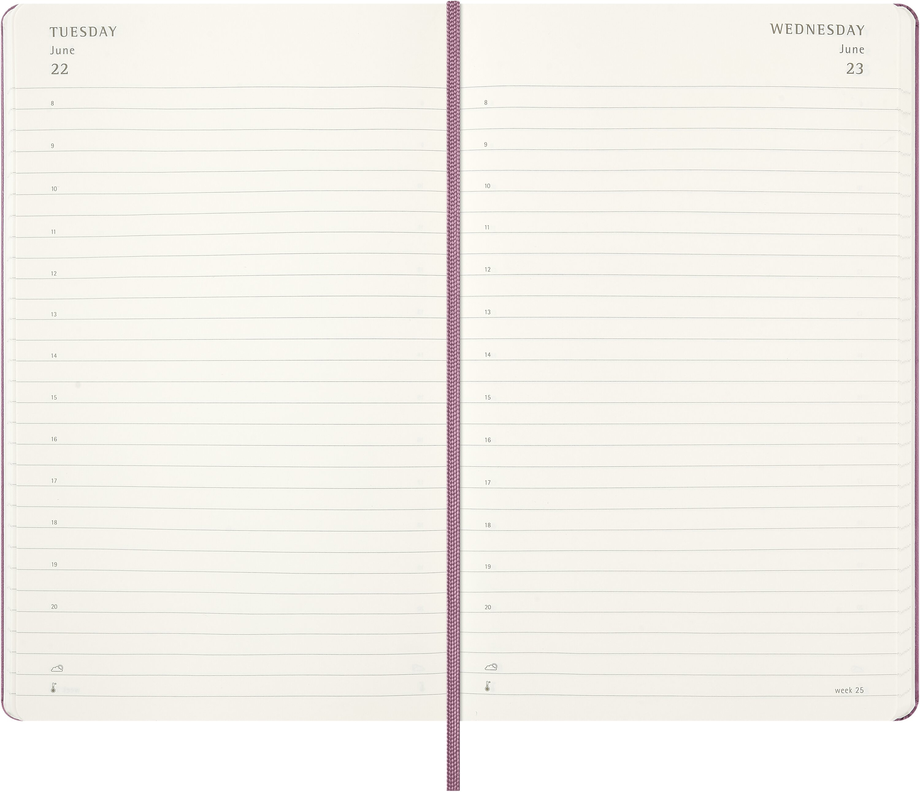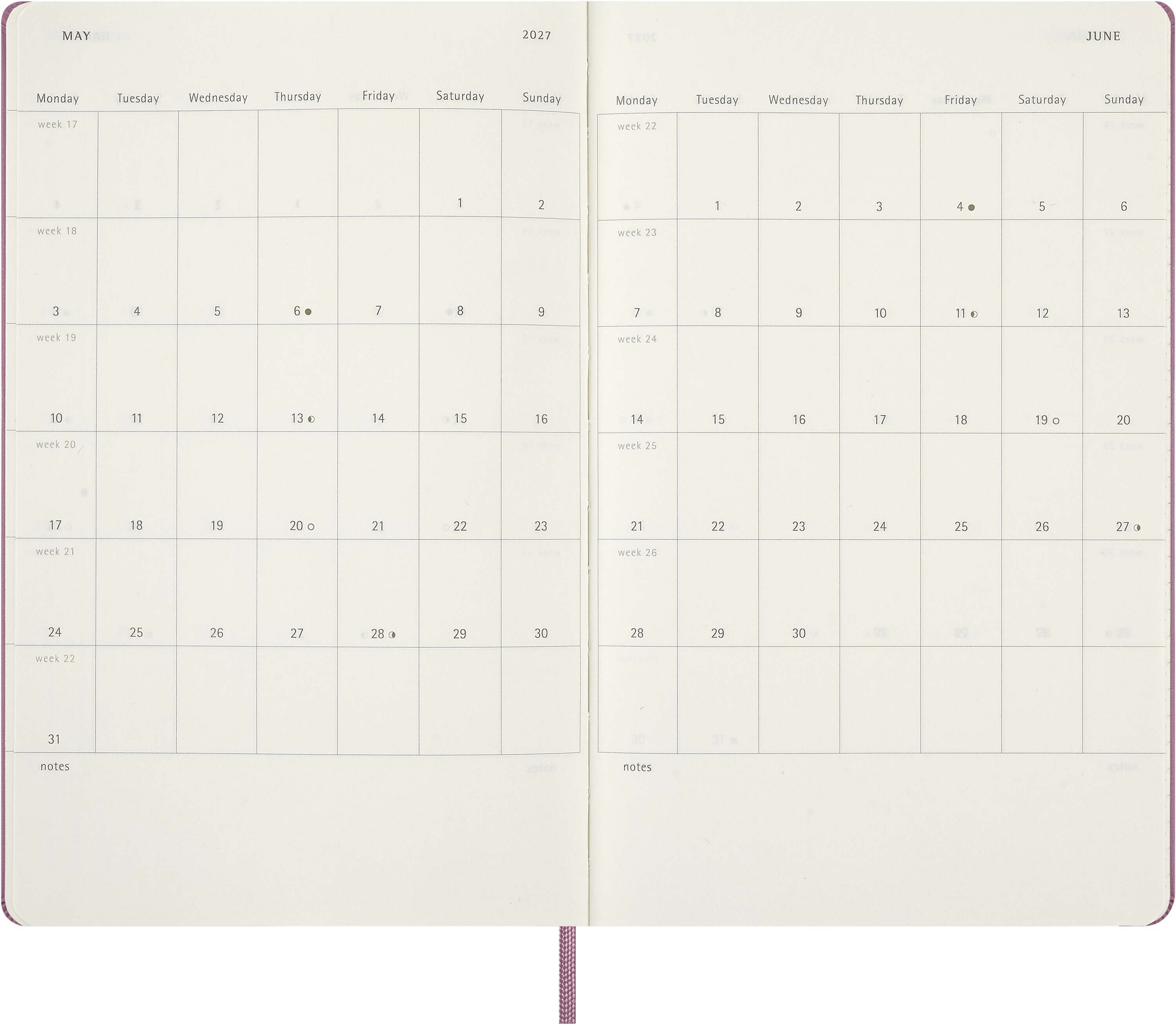 Der Moleskine Tageskalender ist von Januar bis Dezember datiert. Der beliebte Kalender mit einer eigenen Seite pro Tag ist in zahlreichen Farben erhältlich, um jeden Tag im Jahr ausführlich festzuhalten.'- datiert von Januar bis Dezember 2027- erhältlich mit festem Einband- abgerundete Ecken, Gummiband zum Verschließen und passendes Lesezeichenband- elfenbeinweißes säurefreies Papier, 70 g/m²- nützliche Hilfsmittel: Kalendarium, Reiseplanung, Ideen und Ziele, linierte Seiten für Notizen- Sticker zum Gestalten Ihrer Pläne und Jahreszahl-Sticker für den Kalenderrücken - farblich abgestimmte interne Falttasche- Vorsatzblatt mit „In case of loss“-Label- liegt flach, lässt sich vollständig auf 180° öffnen- Das Papier dieses Moleskine Objekts Moleskine Objekts stammt aus nachhaltig bewirtschafteten FSC®-zertifizierten Wäldern und aus anderen kontrollierten Quellen