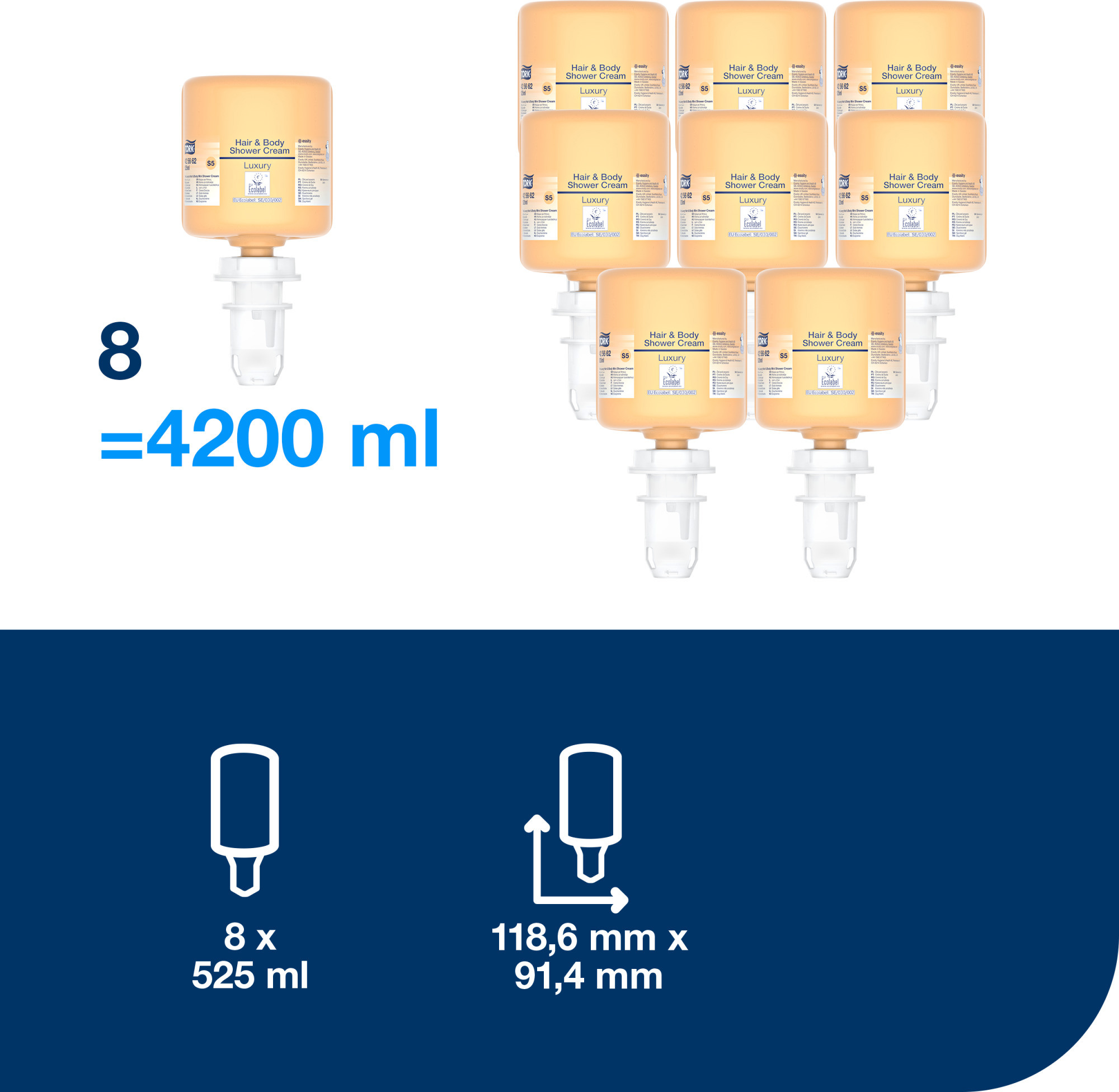 Die Tork Luxuriöse Hair amp Body Mini Duschcreme bietet ein luxuriöses 3-in-1-Shampoo-, Spülung- und Duscherlebnis und ist ideal für Hotels, Wellnessbereiche und Sporteinrichtungen. Formuliert mit Arganöl und Spülung, bietet sie den dreifachen Vorteil eines erfrischenden Shampoos mit Spülung sowie einer feuchtigkeitsspendenden Duschcreme. Neben der sanften Reinigung von Haar und Körper pflegt das Pflegeshampoo das Haar und hält es weich und geschmeidig. Geeignet für Tork Spender für Seifen und Händedesinfektionsmittel, die einfach zu handhaben („Easy to use“) sind und für eine hervorragende Händehygiene sorgen.