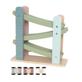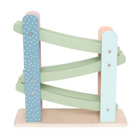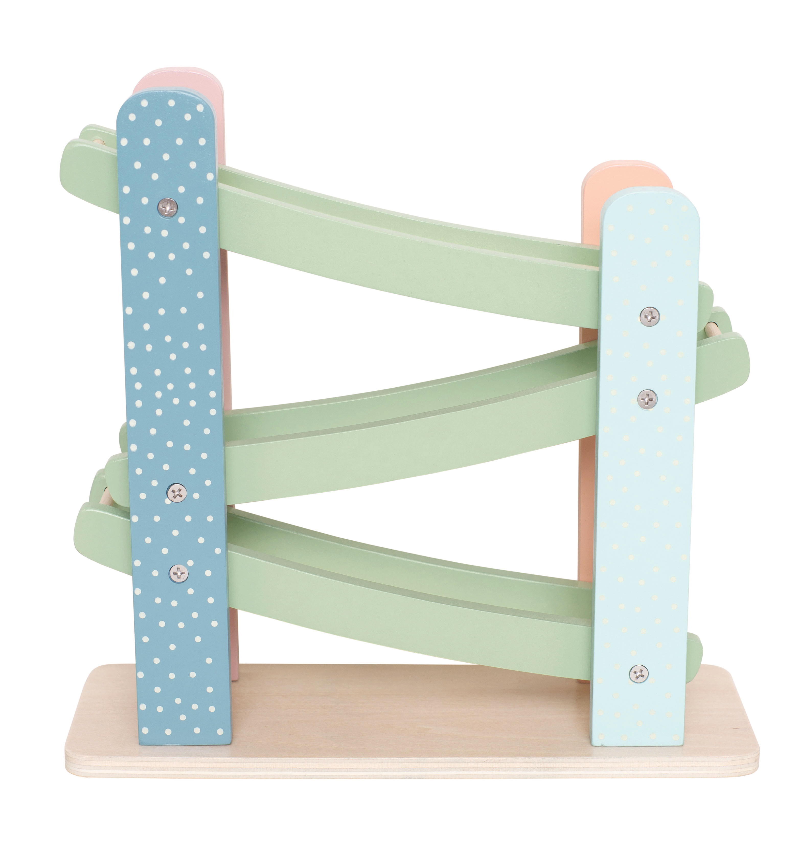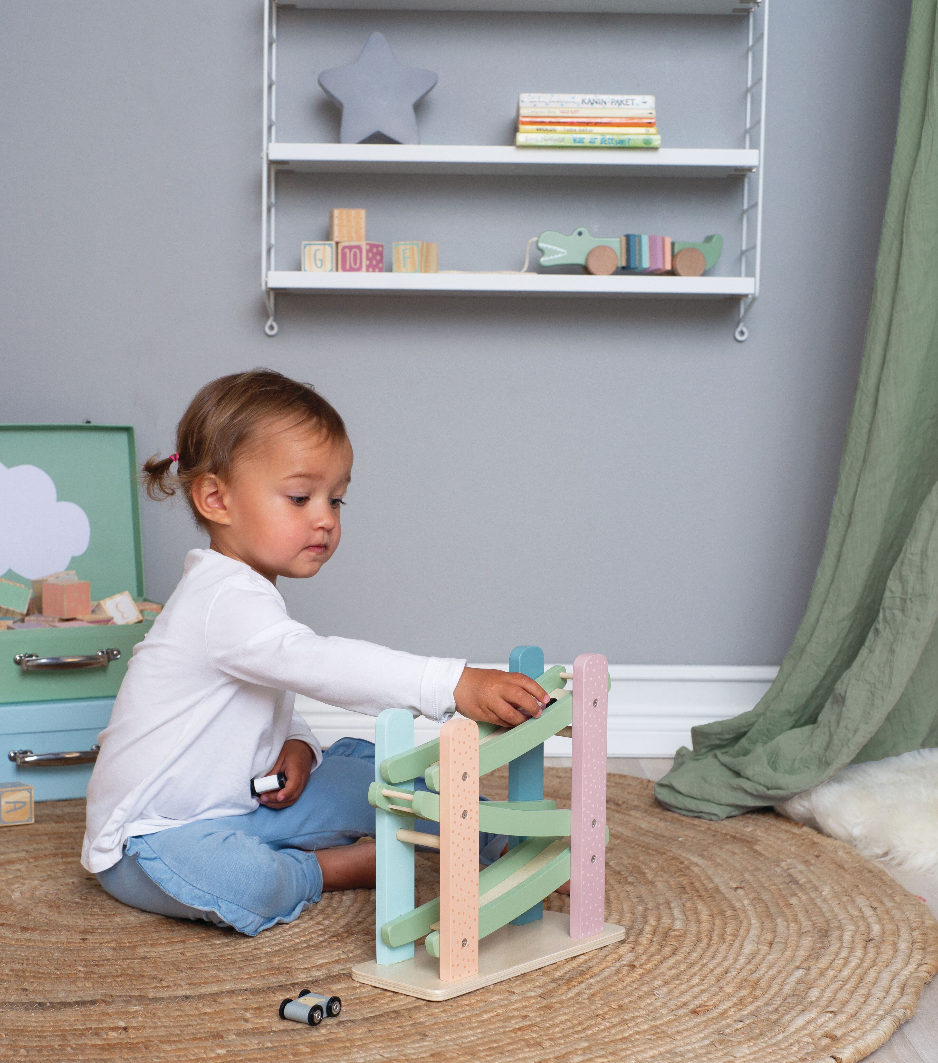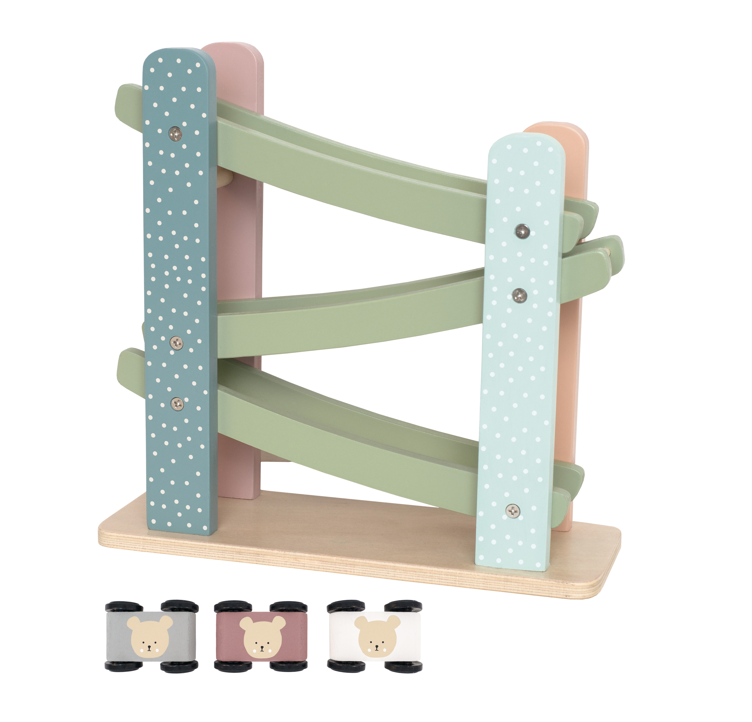 Eine kreative und unterhaltsame Rennbahn für kleine Kinder. Die Bahn enthält 3 Autos in verschiedenen Farbtönen und Farben. Hergestellt aus FSC™-zertifiziertem Holz (FSC™C194598).