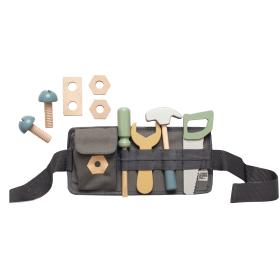 Praktischer Zimmermannsgürtel für kleine Handwerker. Jetzt kann zu Hause beim Nageln und Hämmern geholfen werden. Mit dem Zimmermannsgürtel hat Ihr Kind alles, was es braucht. Der Gürtel wird mit einem Klettverschluss geliefert, der sich leicht um die Hüfte befestigen lässt, und schon kann es mit dem Handwerkern losgehen! Der Gürtel wird mit einem Schwamm gereinigt. Zugelassen ab 18 Monaten. Hergestellt aus FSC™-zertifiziertem Holz (FSC™C194598).